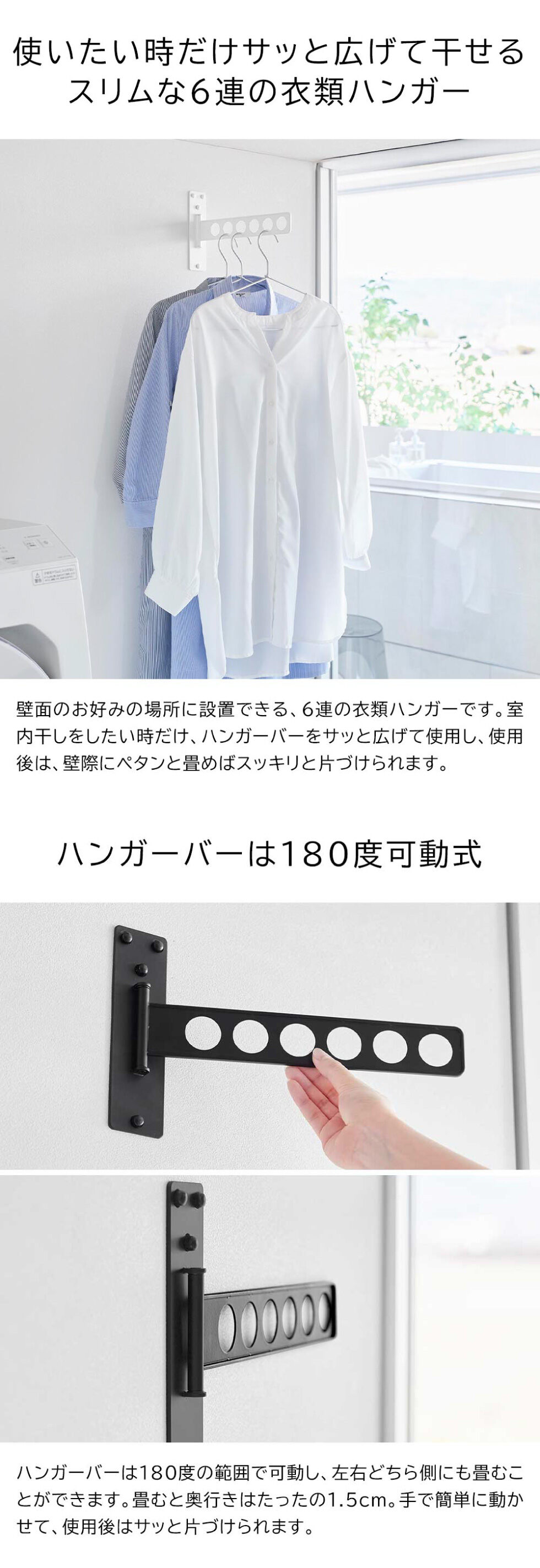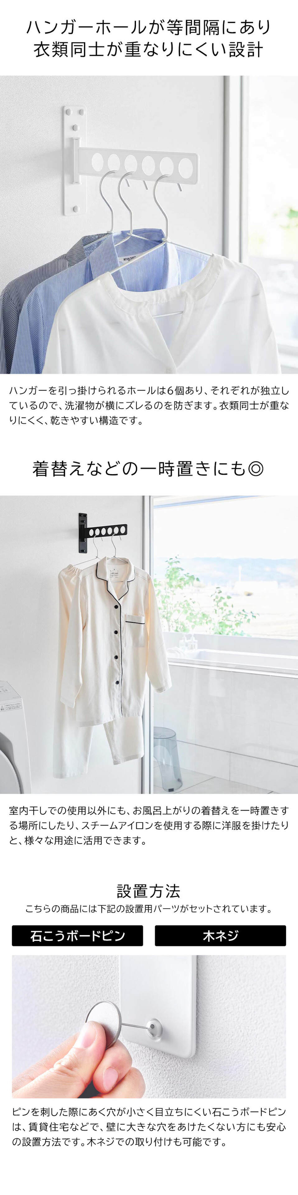 石こうボードピンで簡単取り付け!使わない時はスリムに収納できる6連衣類ハンガーです。衣類同士が重なりにくく乾きやすい構造で、使いたい時にサッと広げて室内干しができるので便利です。ハンガー部は180度可動し、使わない時は奥行きが1.5cmとスリムに収納できます。壁の穴が目立ちにくい石こうボードピンで簡単取り付け。木ネジでも取り付け可能。