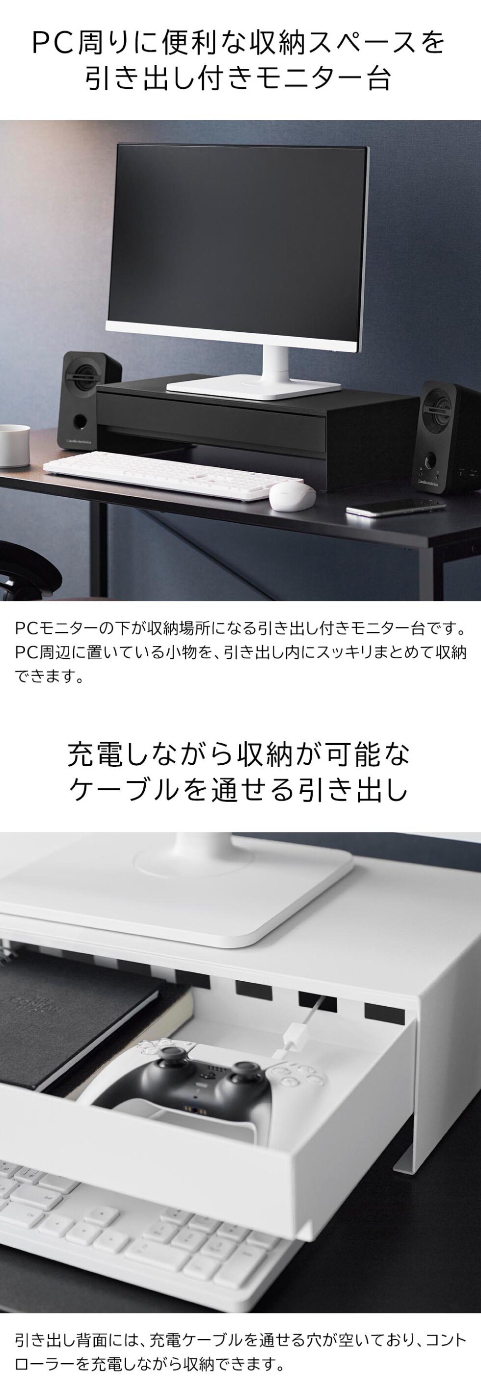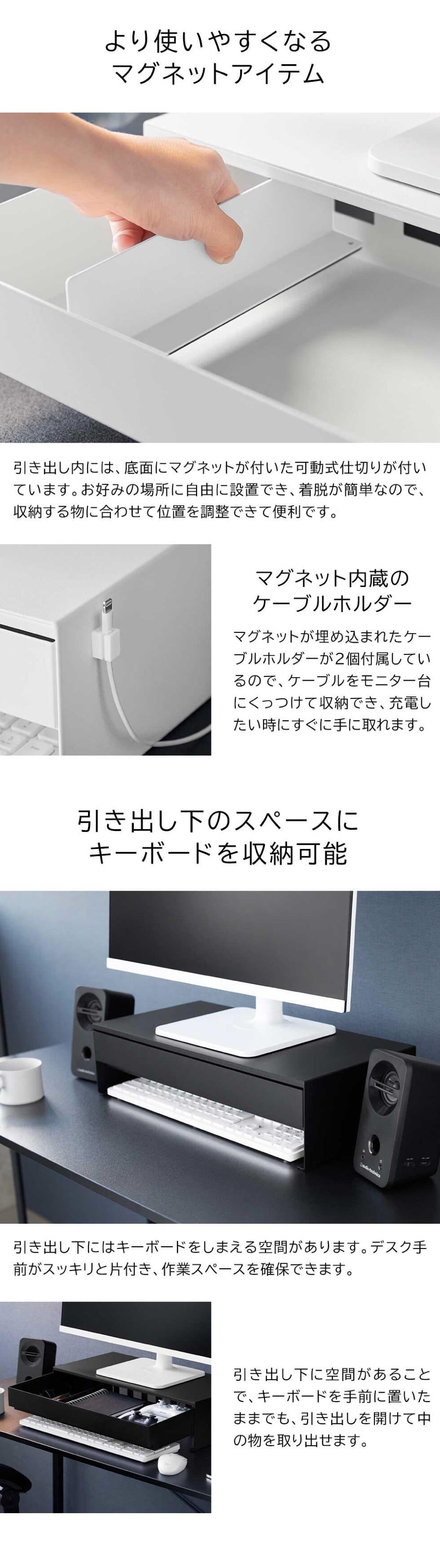 モニター下のデッドスペースを有効活用!ゲームコントローラーも入る広々設計の引き出し付きモニター台です。引き出し内には、可動式のマグネット付き仕切りが付いているので、整理がしやすく便利。引き出し奥には充電ケーブルを通せる穴が空いていて、収納しながらの充電も可能です。引き出し下スペースにはキーボードが収納可能。マグネット内蔵のケーブルホルダーが2個付属しており、ケーブル類もスッキリ整理できます。