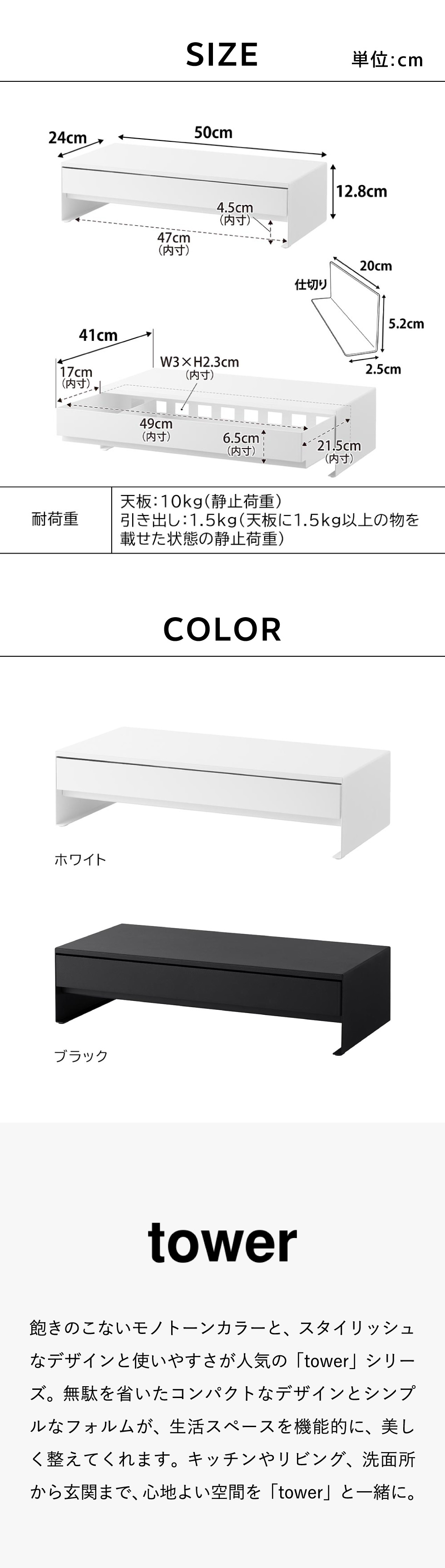 引き出し:1.5kg(天板に1.5kg以上の物を載せた状態の静止荷重)