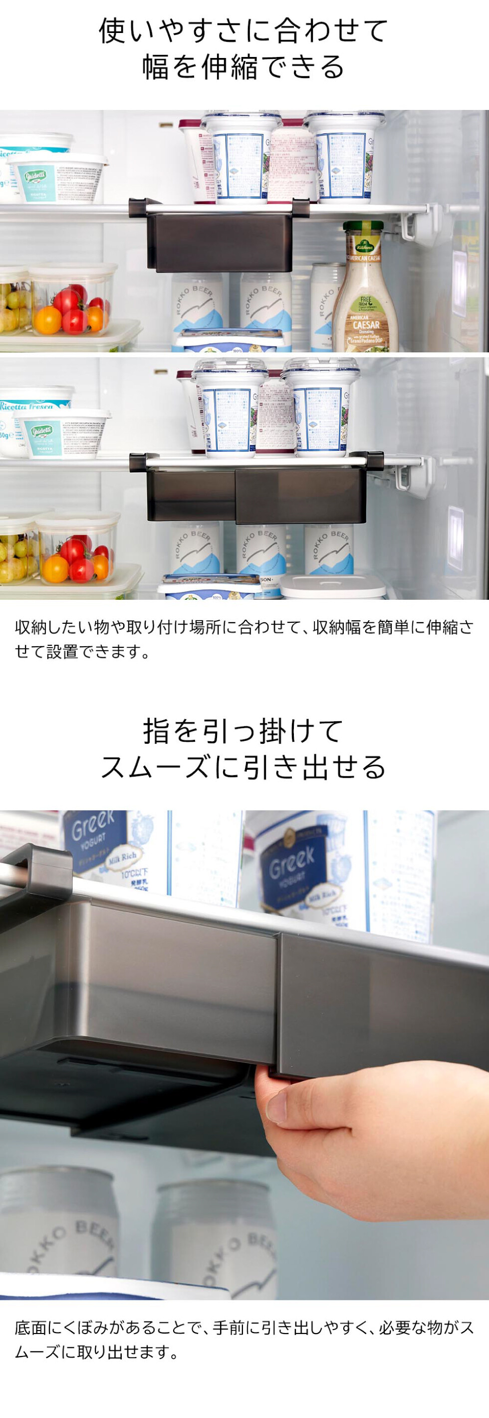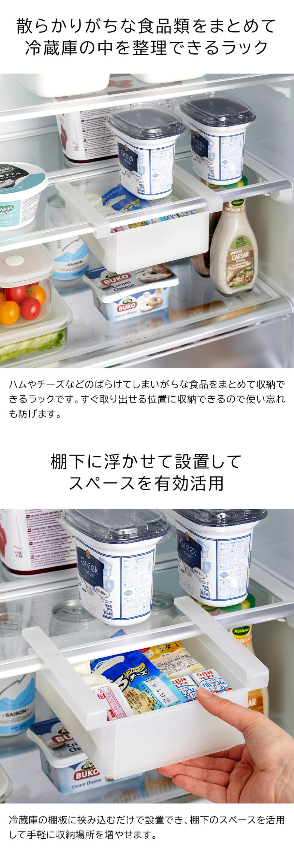 冷蔵庫の棚下のスペースを活用してチーズやハムなどをまとめて収納できるラック。棚板に挟み込むだけで簡単設置。幅を伸縮できるので収納したい物に合わせて調節可能。