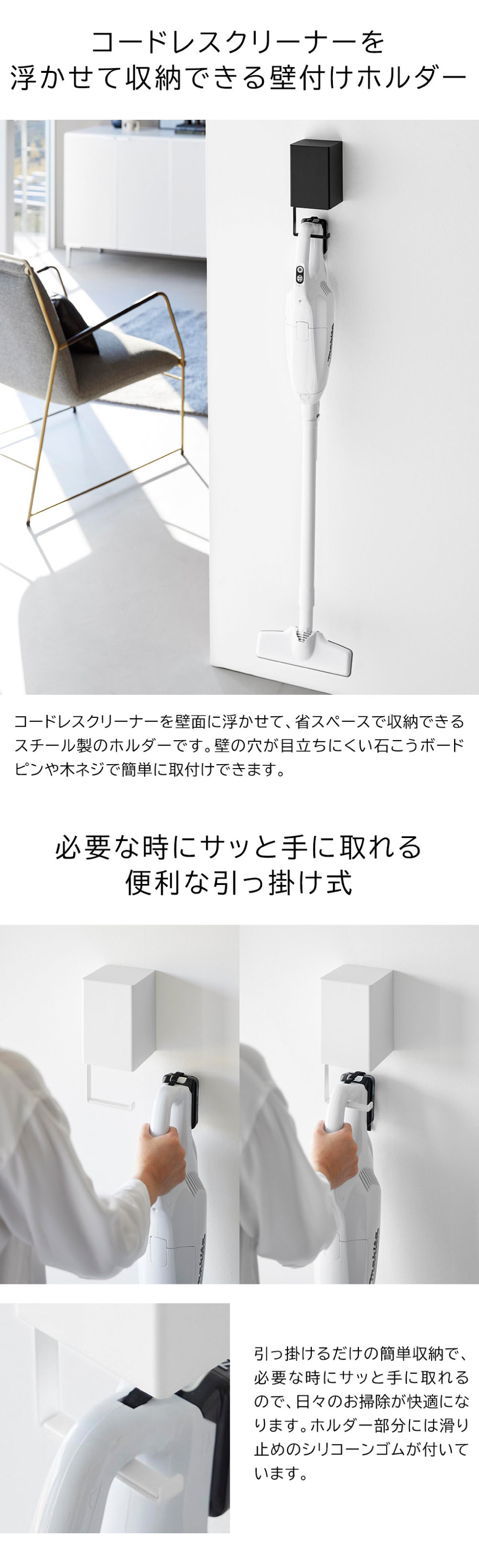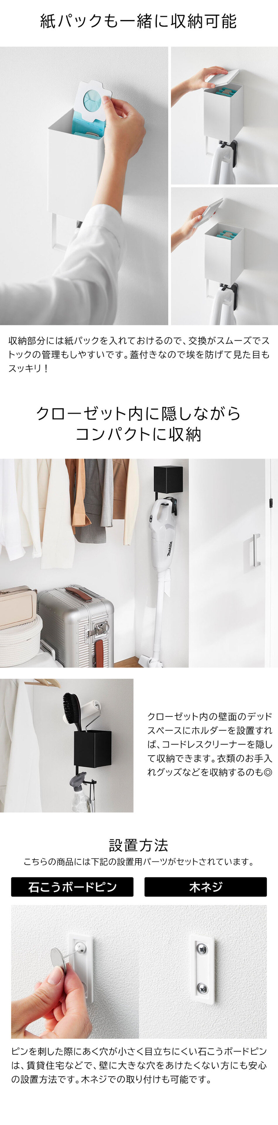 コードレスクリーナーを壁に浮かせて収納!引っ掛けるだけの簡単収納で、使いたい時にサッと手に取ることができます。紙パックも一緒に収納することができ、交換やストック管理に便利。クローゼット内に設置して、小物収納としての使用もおすすめです。壁の穴が目立ちにくい石こうボードピンで簡単取り付け。木ネジでも取り付け可能。
