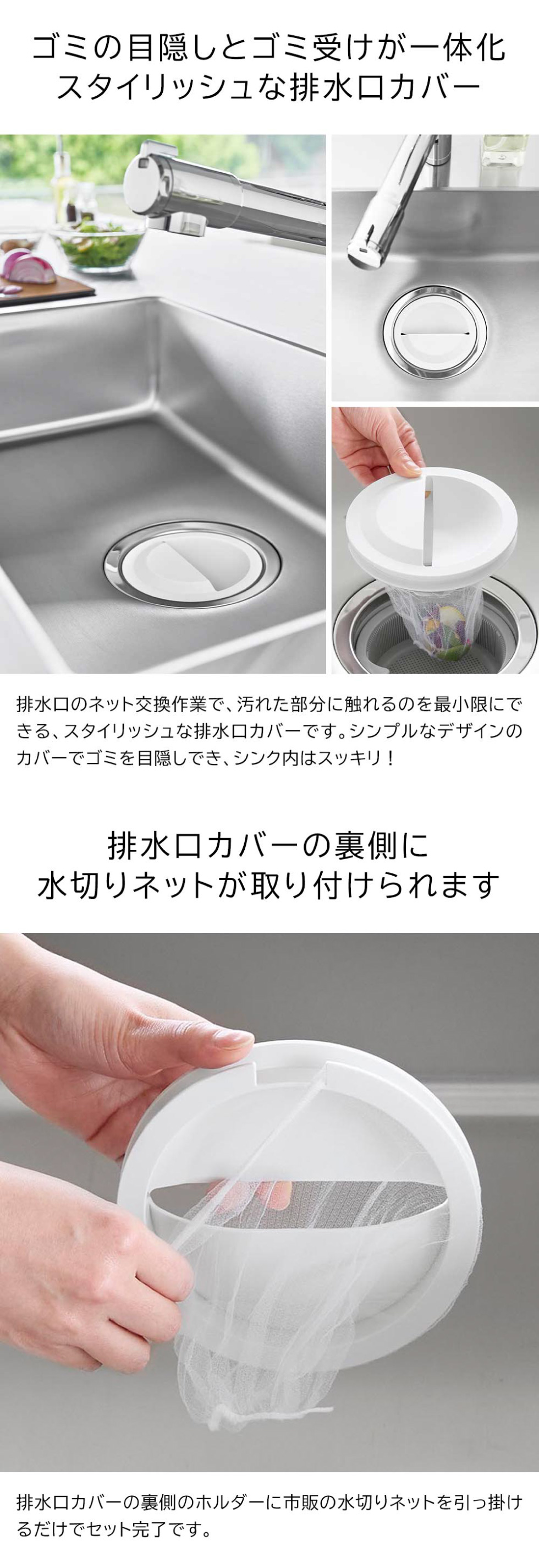 ゴミを隠して、シンクがすっきり!水切りネットホルダー付きの排水口カバー。カバー裏側のホルダーにネットを引っ掛けるだけで簡単に取り付けることができます。ネットは下へ引っ張ると簡単に外せます。