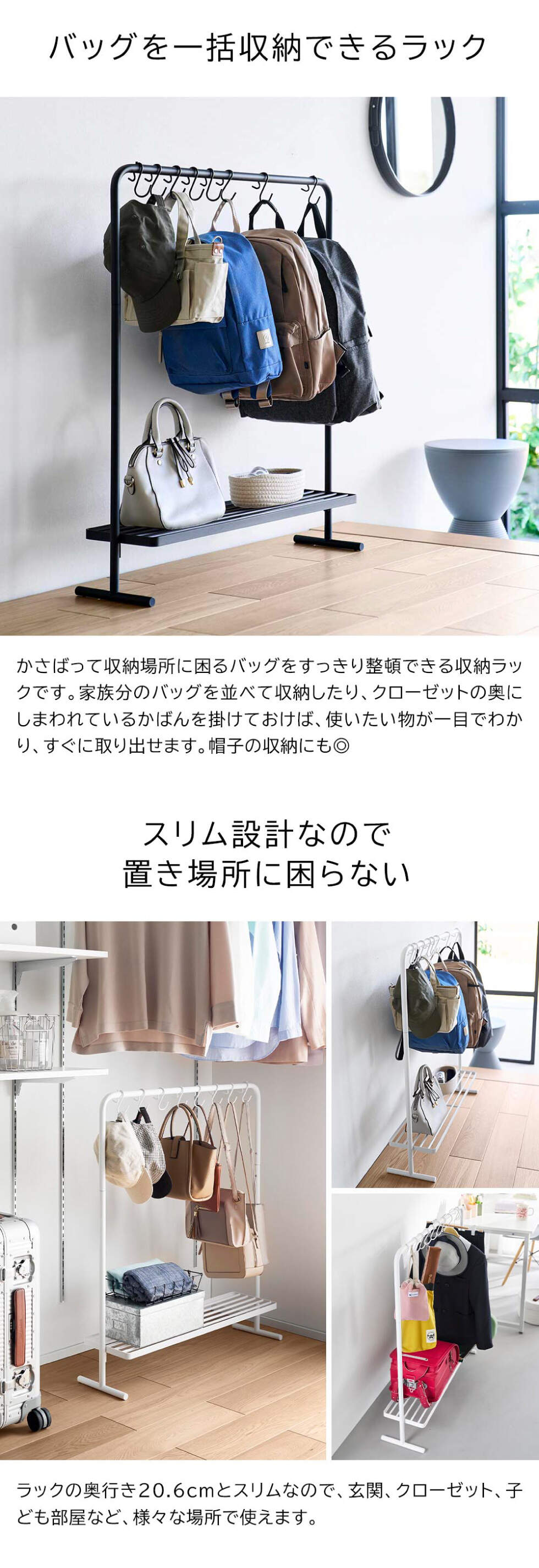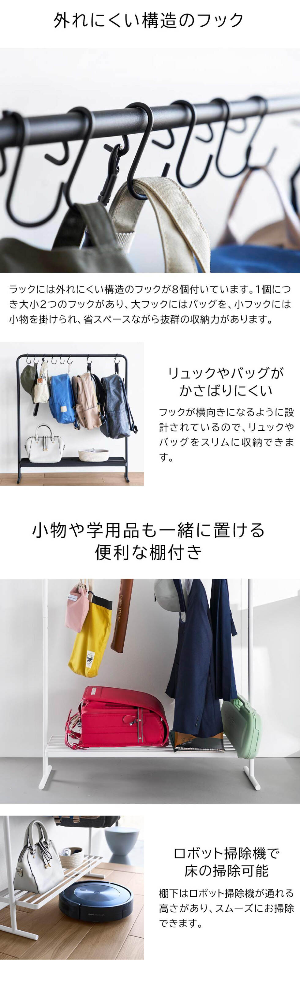 奥行きスリム設計で、バッグをすっきりまとめて収納できるラックです。外れにくい構造のフックが8個付きで、バッグ以外の小物収納にも便利です。棚下はロボット掃除機が通れる高さがあり、お掃除もスムーズ。