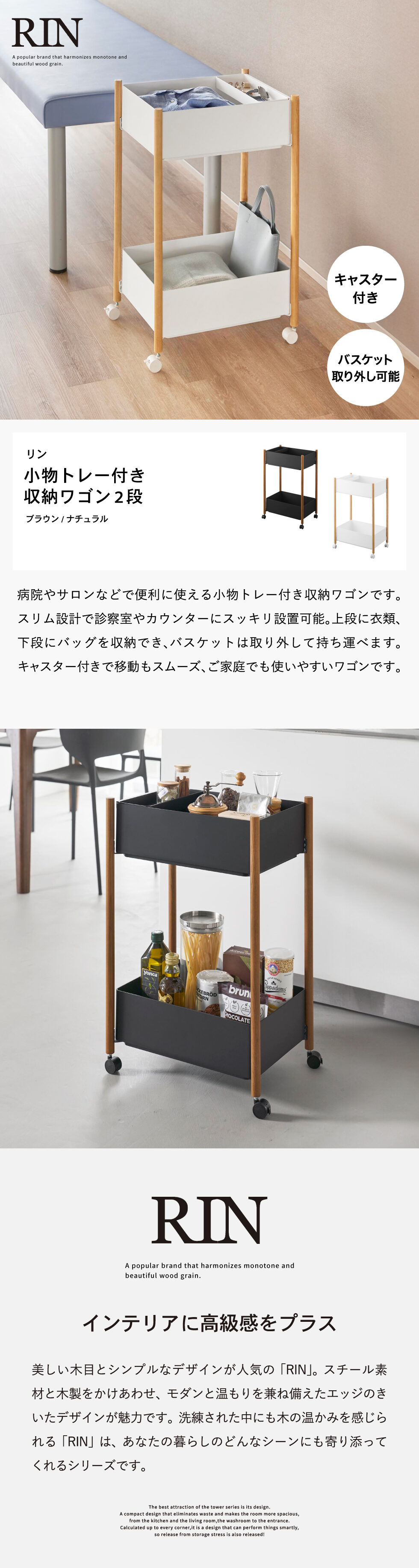 美しくあたたかい雰囲気の優しい木目と、シンプルでナチュラルさを持つデザイン。 スチール素材と木製をかけあわせ、モダンと温もりを兼ね備えたエッジの効いたデザインが魅力です。そして、シンプルながら、より豊かな暮らしを提案するアイデアがたくさん詰まった、使いやすさが人気のRINシリーズ。RINのアイテムをライン使いすれば、すっきりとした統一感が生まれ、洗練された中にもウッド調の温かみを感じられる落ち着いた雰囲気を演出します。キッチンやリビング、洗面所から玄関まで揃えたくなる高い機能性のアイテムで、毎日の暮らしを彩る心地よい空間を。