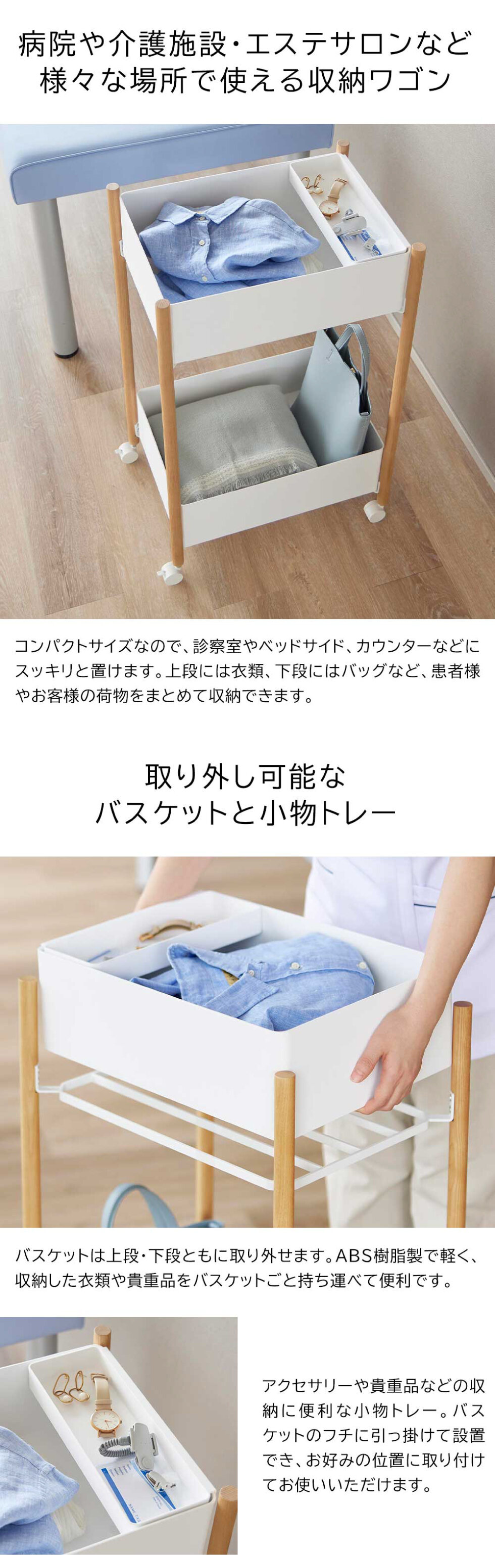病院・エステサロンなどで便利に使える小物トレー付き収納ワゴンです。コンパクトサイズなので、診察室やカウンター周りにもスッキリと設置できます。上段には衣類を、下段にはバッグを収納でき、バスケットは取り外してそのまま持ち運べます。小物トレーはアクセサリーや貴重品などの収納に便利。キャスター付きで移動もスムーズです。木との組み合わせが上品で、馴染みやすいデザインです。