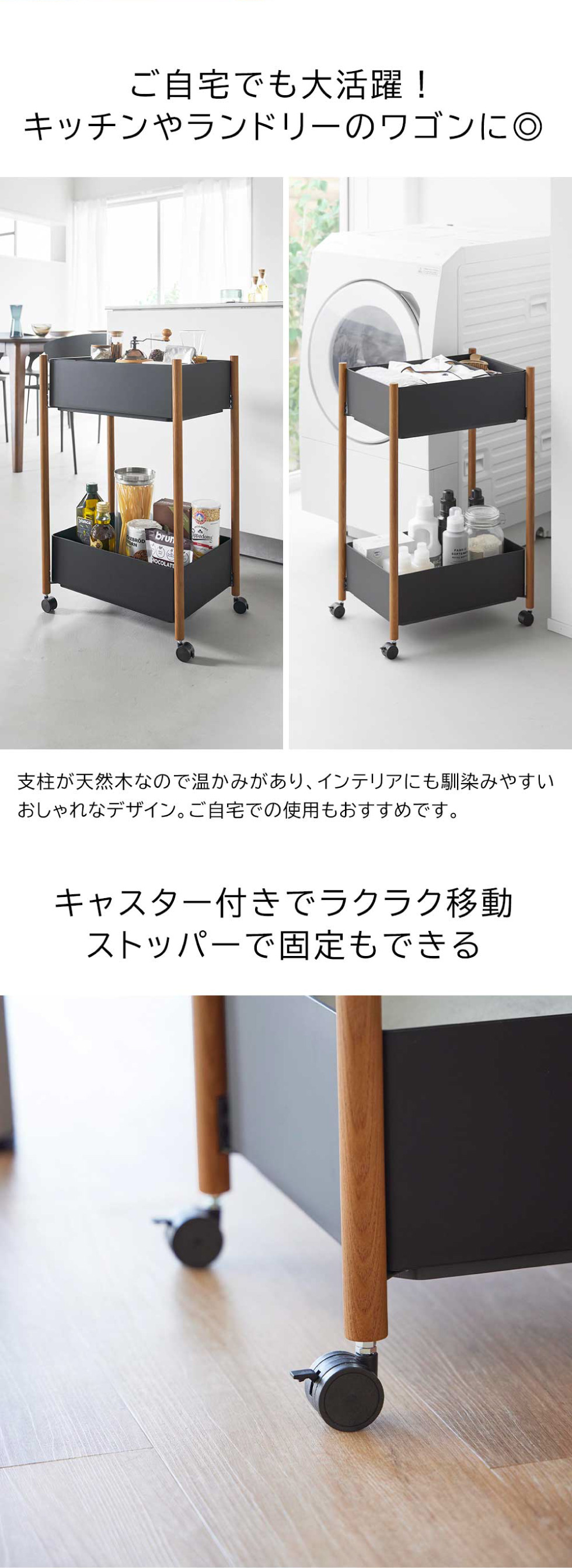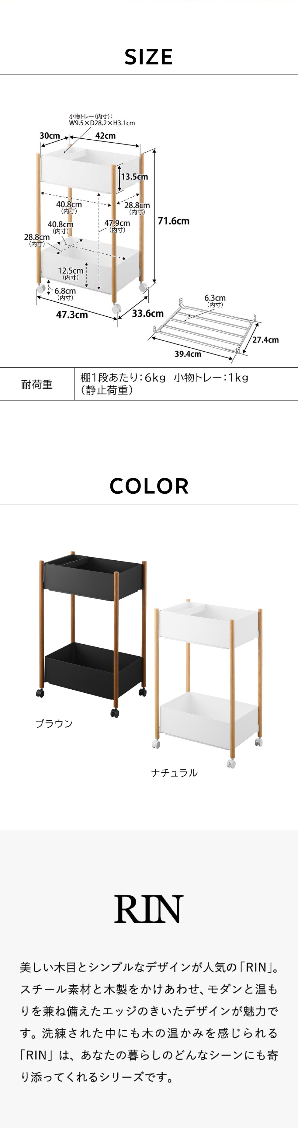 品質表示 棚:スチール(粉体塗装) 支柱:天然木(ウレタン樹脂塗装) バスケット・小物トレー:ABS樹脂 キャスター:ナイロン |