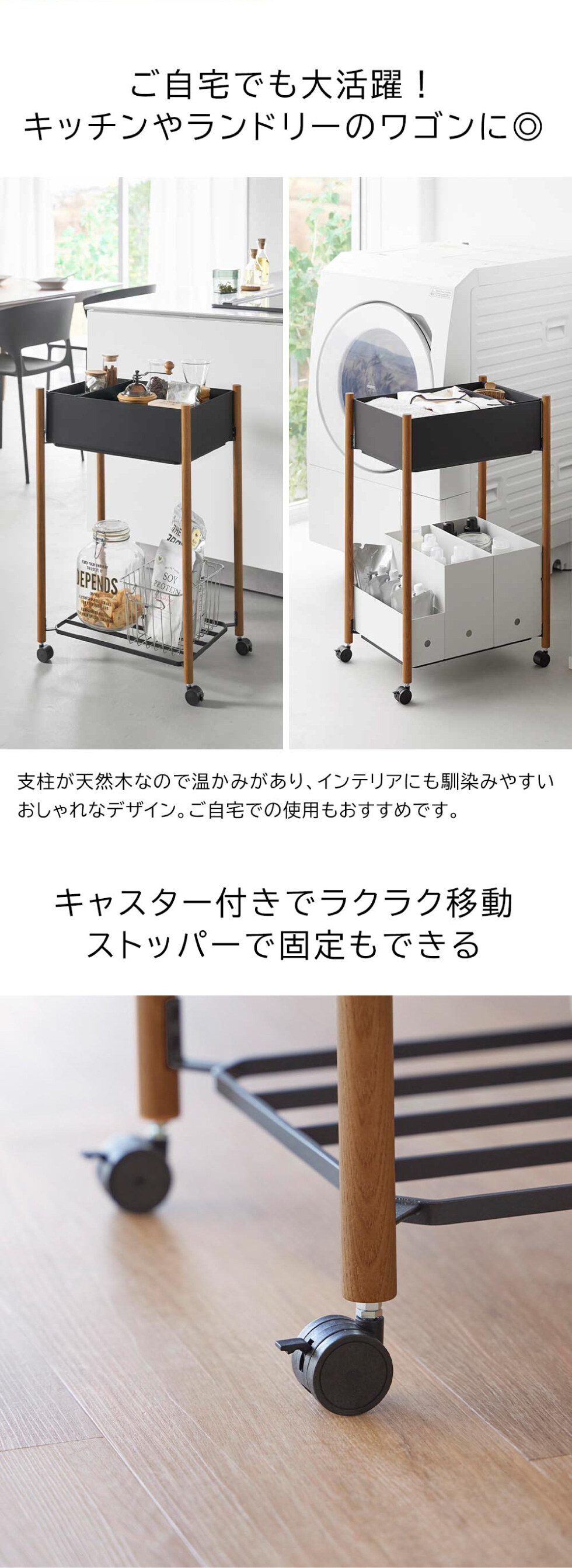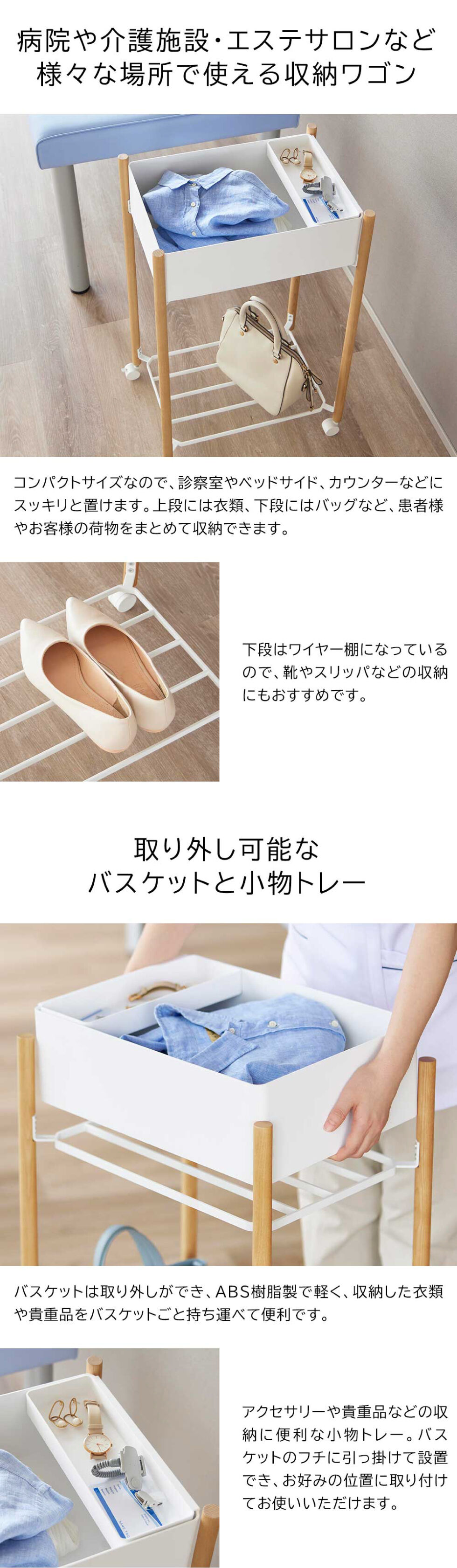 病院・エステサロンなどで便利に使える小物トレー付き収納ワゴンです。コンパクトサイズなので、診察室やカウンター周りにもスッキリと設置できます。下段はワイヤー棚になっており、靴などの収納に最適。バスケットは取り外して持ち運びが可能で、小物トレーはアクセサリーや貴重品などの収納に便利です。キャスター付きで移動もスムーズ。木との組み合わせが上品で、馴染みやすいデザインです。