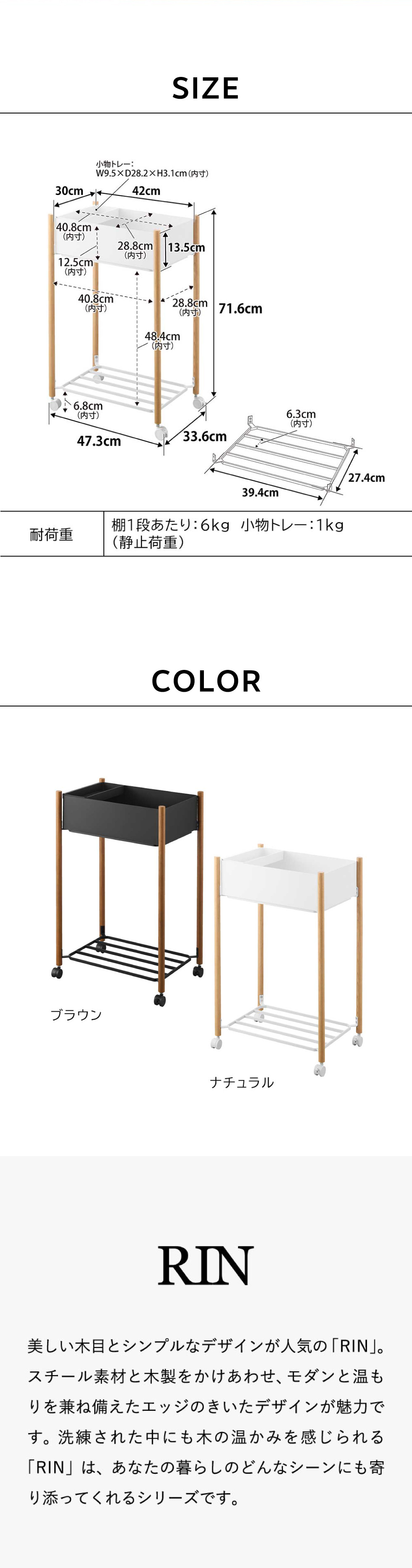 品質表示 棚:スチール(粉体塗装) 支柱:天然木(ウレタン樹脂塗装) バスケット・小物トレー:ABS樹脂 キャスター:ナイロン |