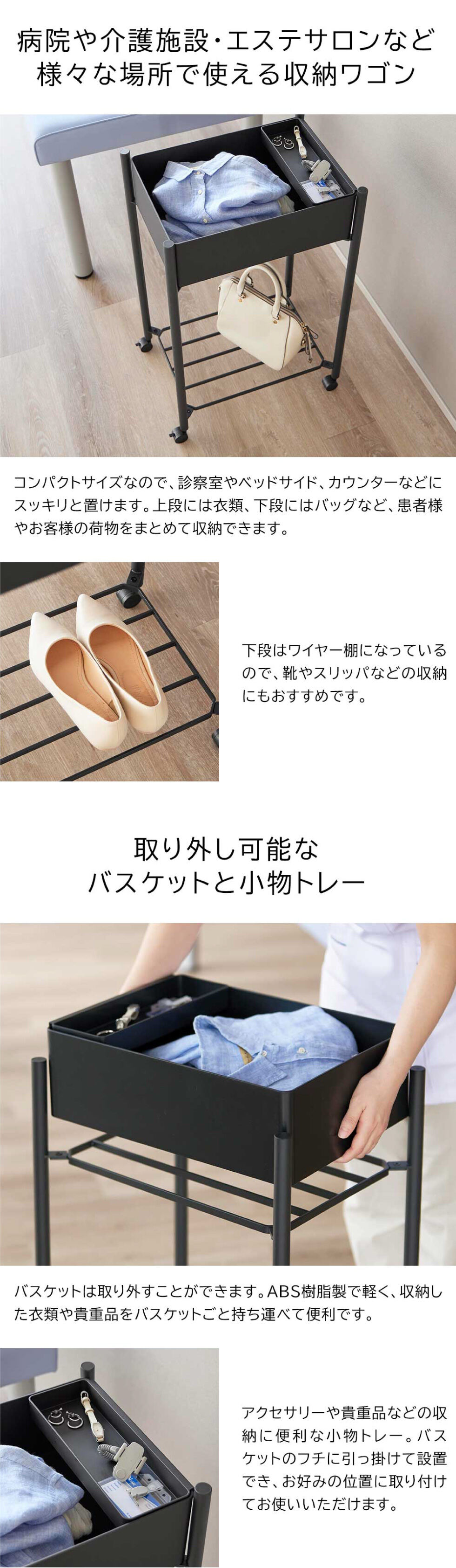 病院や介護施設、エステサロンなどで便利に使えるコンパクトな2段式ワゴン。キャスター付きで移動がラク。バスケットと小物トレーは、取り外して持ち運び可能。