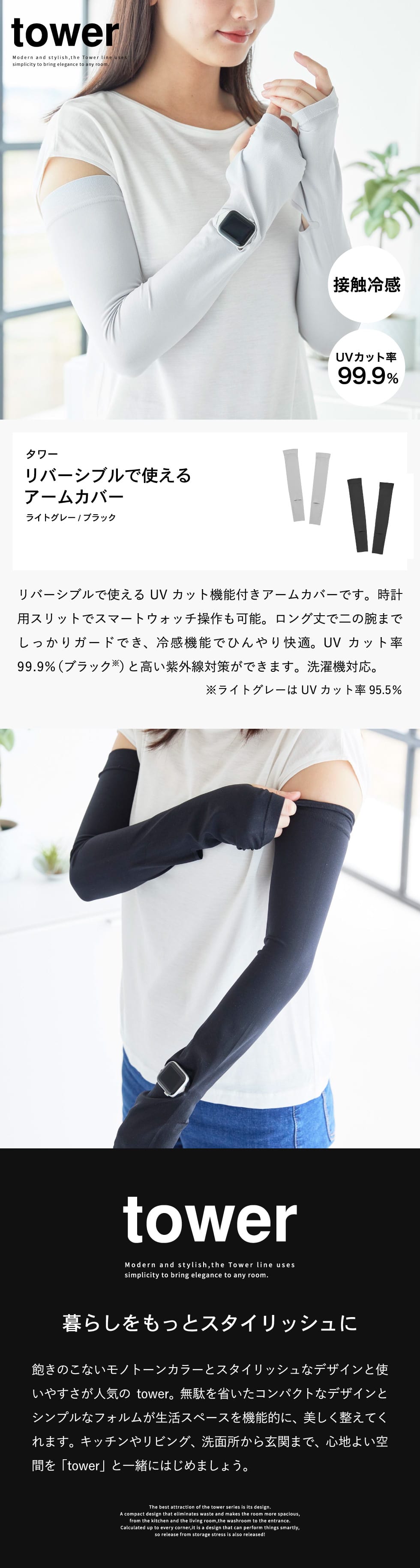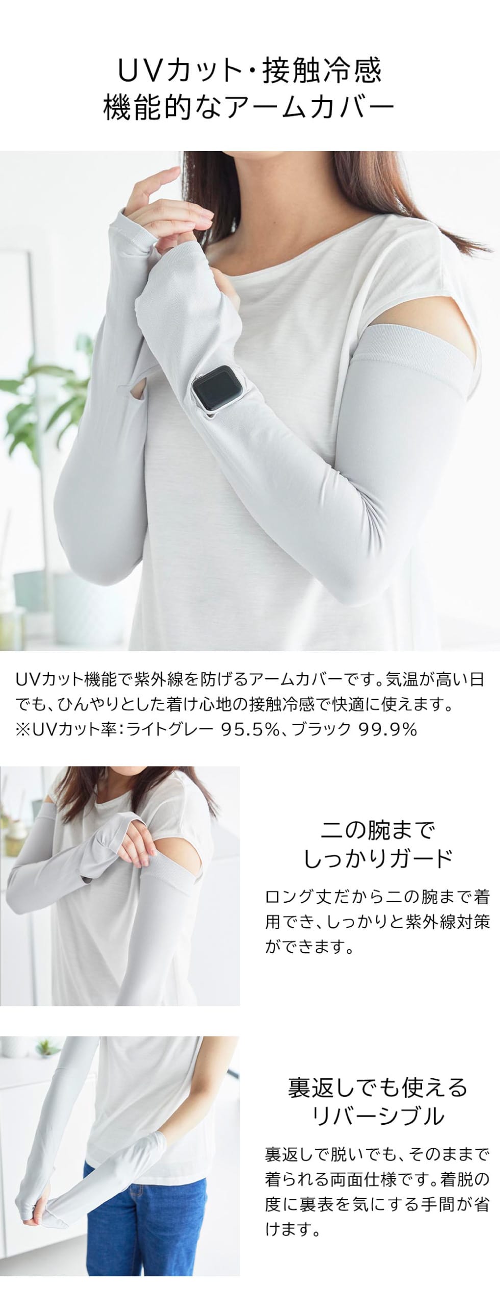 リバーシブルで使えるUVカット機能付きアームカバー。時計用スリットが入っているのでスマートウォッチの操作が可能で便利です。ロング丈なので二の腕まで紫外線対策ができ、 肌に触れた時にひんやり冷たい接触冷感機能付き。両面ともに使用可能で、裏返す手間がなく使用できます。UVカット率95.5%(ライトグレー)・UVカット率99.9%(ブラック) 洗濯機OK。