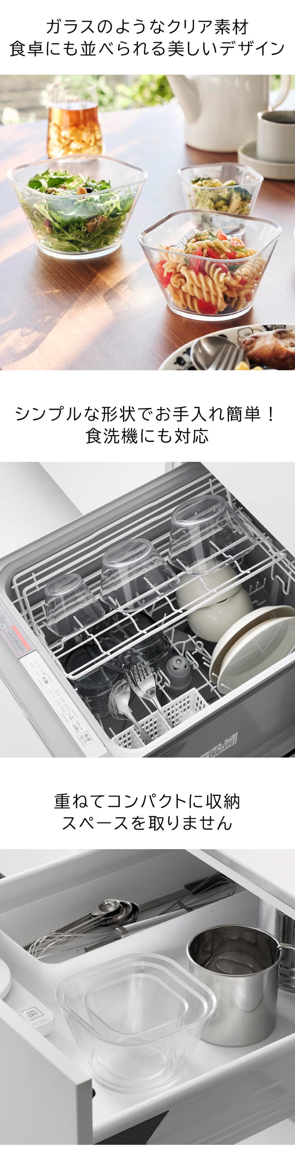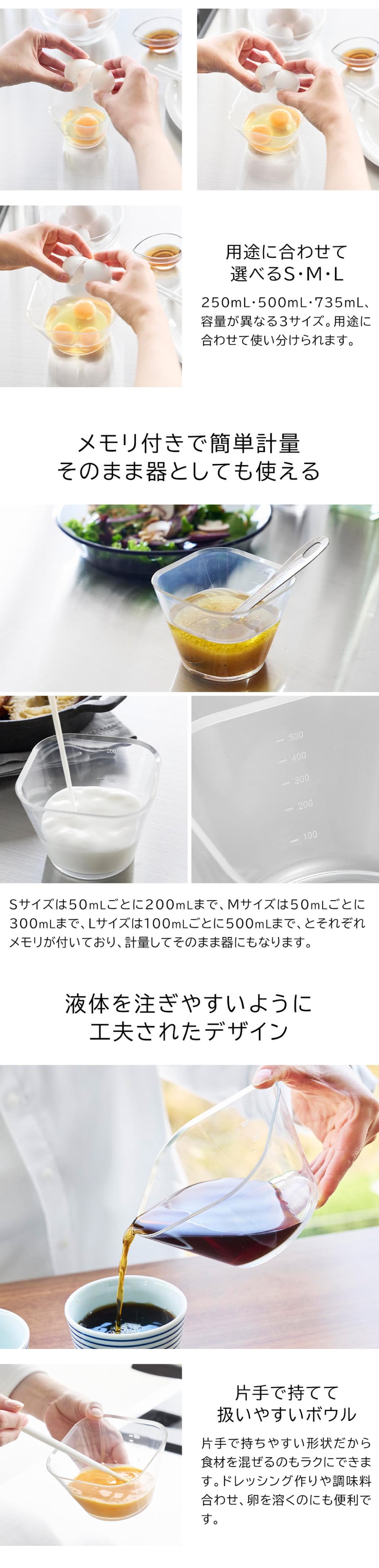 軽くて扱いやすい!メモリ付きで計量ができる下ごしらえに便利なボウルです。片手で持ちやすく注ぎやすい形状で水切れがよく、自家製ドレッシング作りや出汁作りなどにも便利です。ガラスのような透明感で、食卓にそのまま器としても出せるデザインのボウルです。重ねて収納可能。食洗機OK。電子レンジOK。冷凍OK。※内容物による
