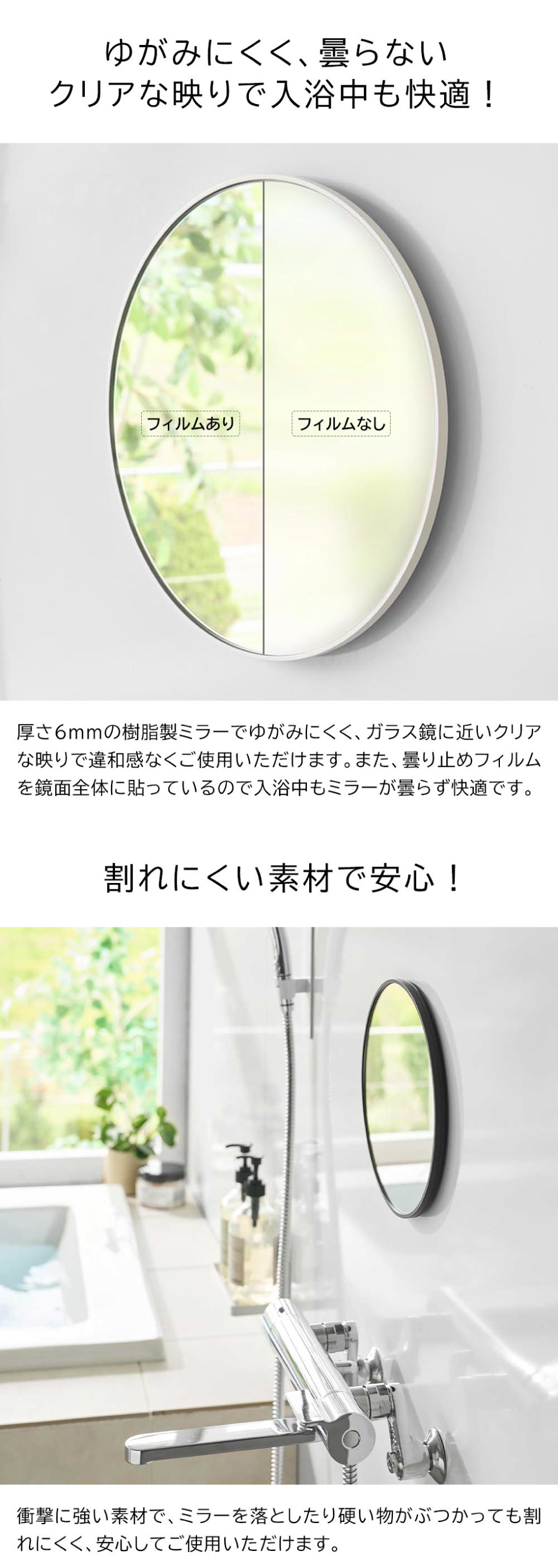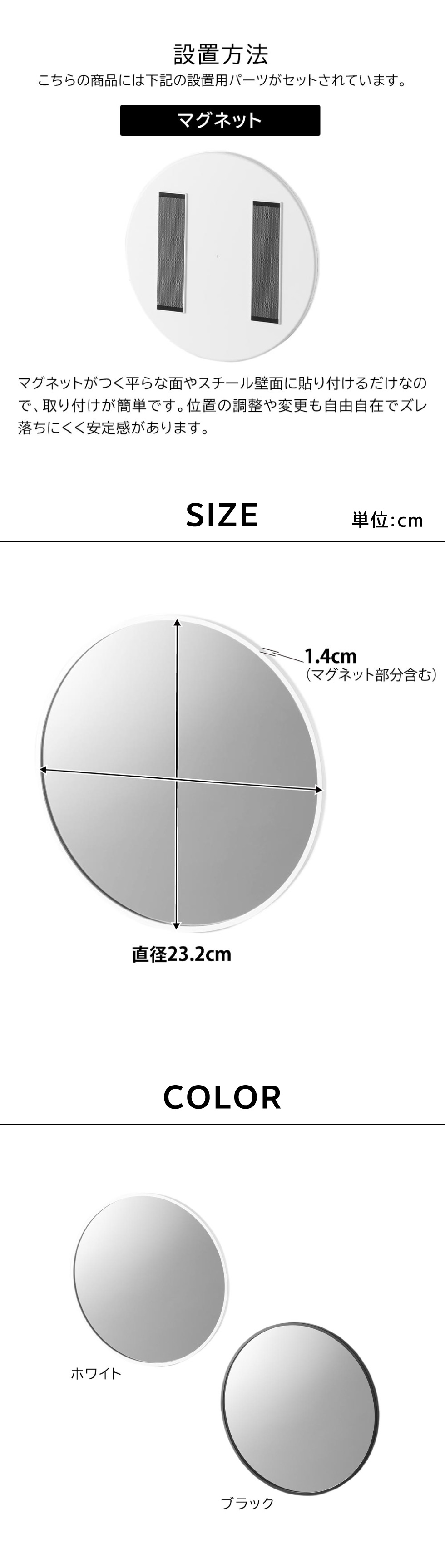 落としても割れにくい樹脂ミラー丸型23cmです。マグネットでお好みの場所に簡単に設置できます。曇り止め加工を施した厚さ6mmの樹脂製バスルームミラーで、ゆがみにくく衝撃にも強い仕様です。フレームと壁の隙間に指を入れやすい形状で、取り外しも簡単。お掃除がしやすく清潔に保てます。さらに、曇り止めフィルムを全面に粘着加工しているため、快適にお使いいただけます。