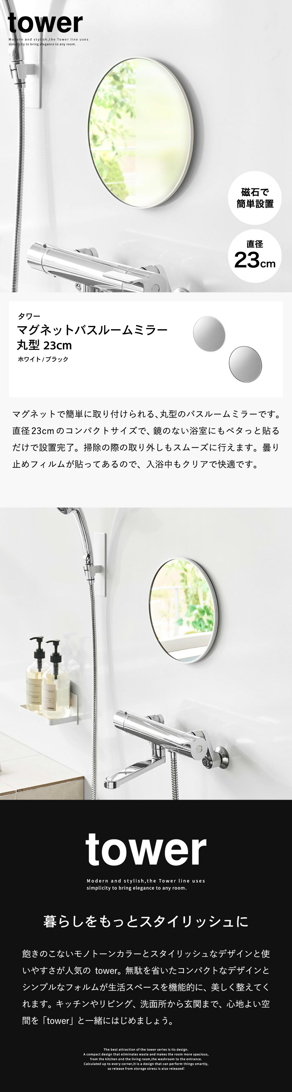 マグネットバスルームミラー タワー 丸型 23cm 山崎実業 公式 tower 10175 10176 ホワイト ブラック