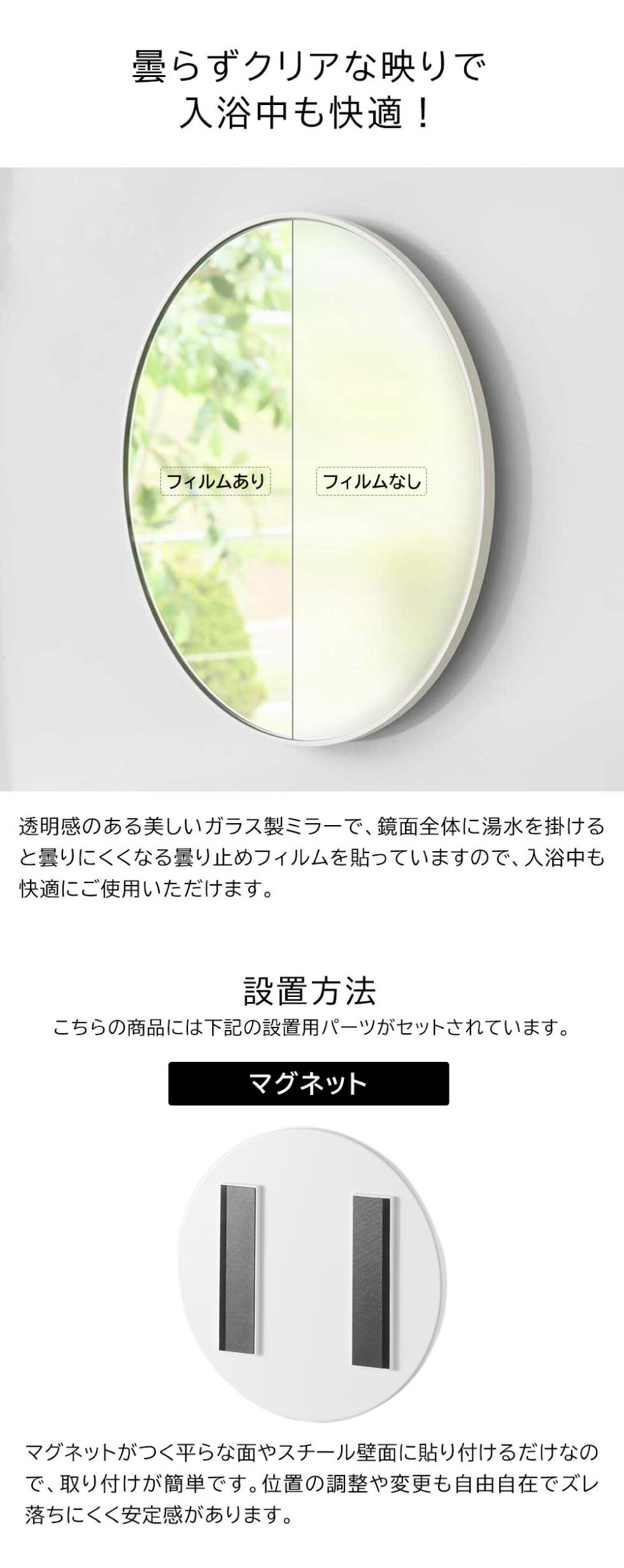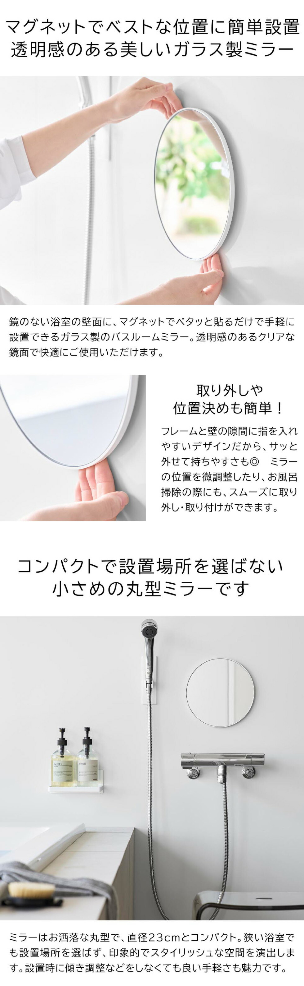マグネットで簡単設置!透明感があり美しいガラス製のコンパクトな丸型バスルームミラー。曇り止め加工で入浴中の使用感も◎ 着脱しやすいフレーム形状で、場所移動もラクラク。