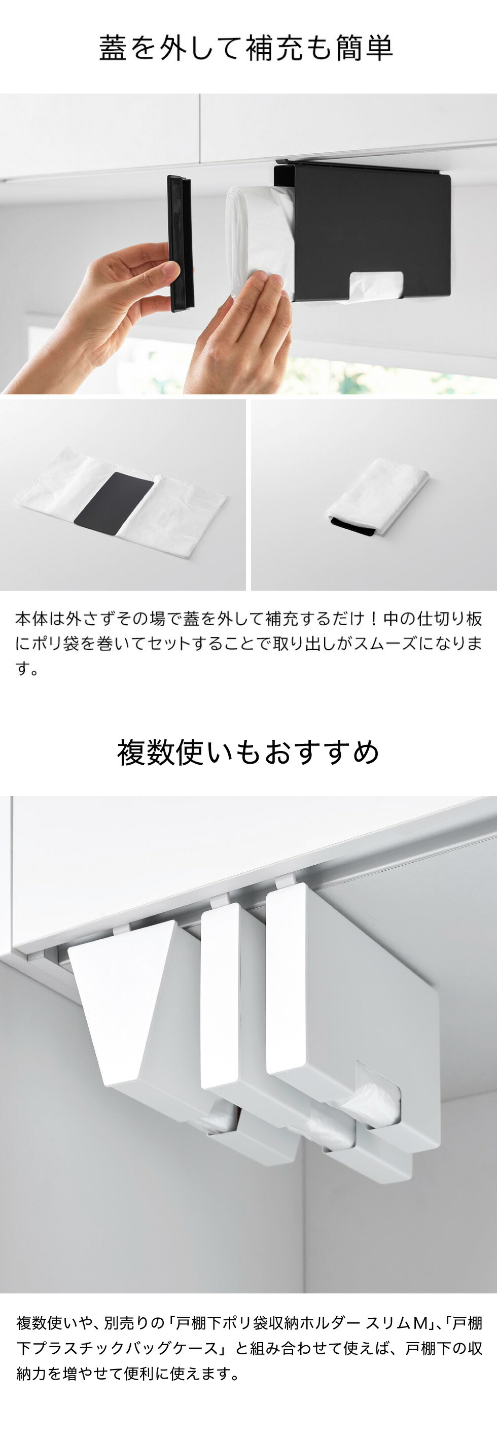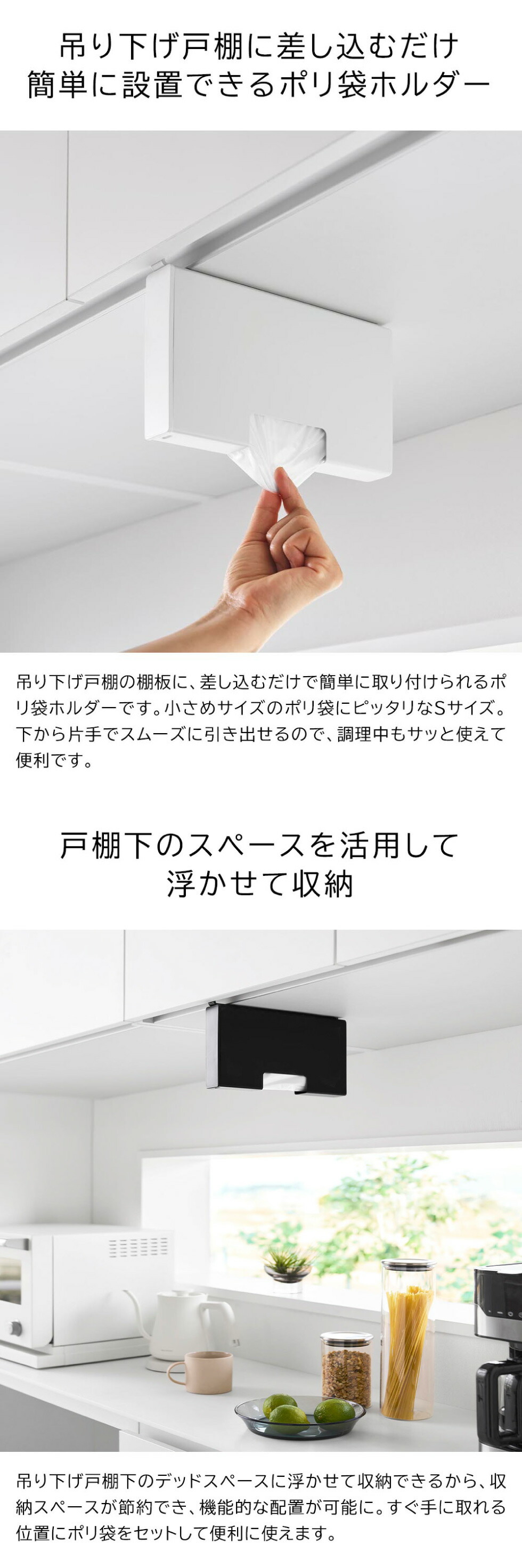 戸棚下の空いたスペースを活用して簡単設置。よく使うポリ袋をサッと片手で取り出せるホルダー。小さめポリ袋にピッタリのSサイズ。設置したまま蓋をあけて簡単に補充可能。