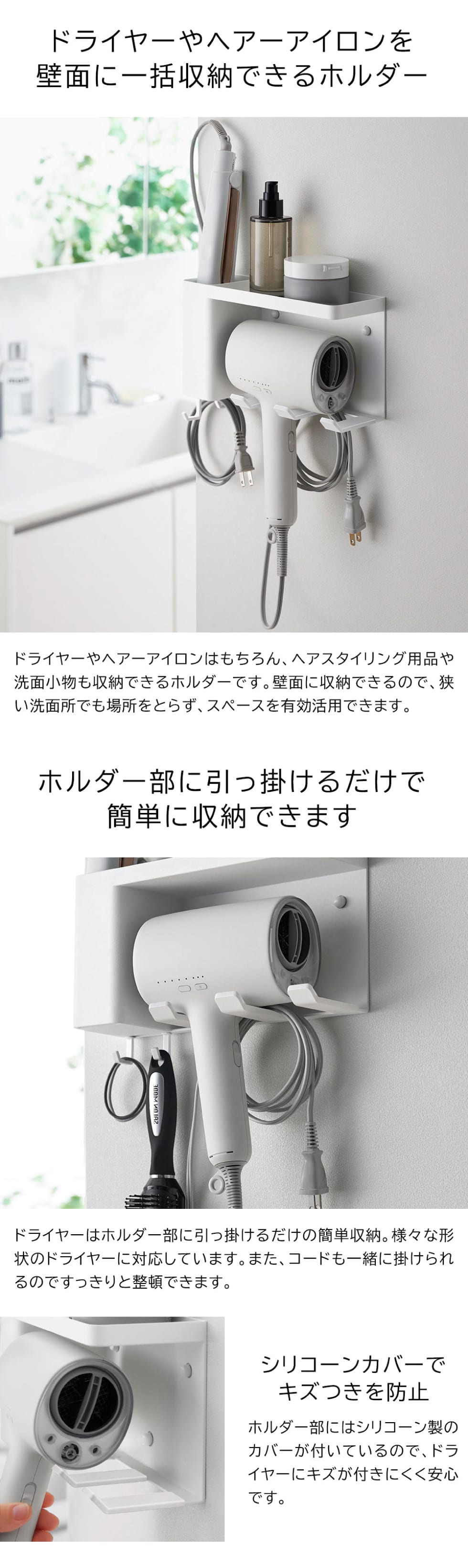 石こうボードピンで壁に簡単取り付けできる、トレー付きのドライヤーホルダーです。ドライヤーは引っ掛けるだけの簡単収納で、様々な形状に対応しており、ヘアーアイロンやブラシドライヤーなどもまとめて収納できます。電源コードもホルダー部に掛ければ、すっきりと収納。ホルダー部にはシリコーン製カバーが付いているので、ドライヤーにキズがつきにくい仕様です。上部は小物置きとして使えるトレーになっており、小物を引っ掛けておくのに便利な可動式フックも付属しています。