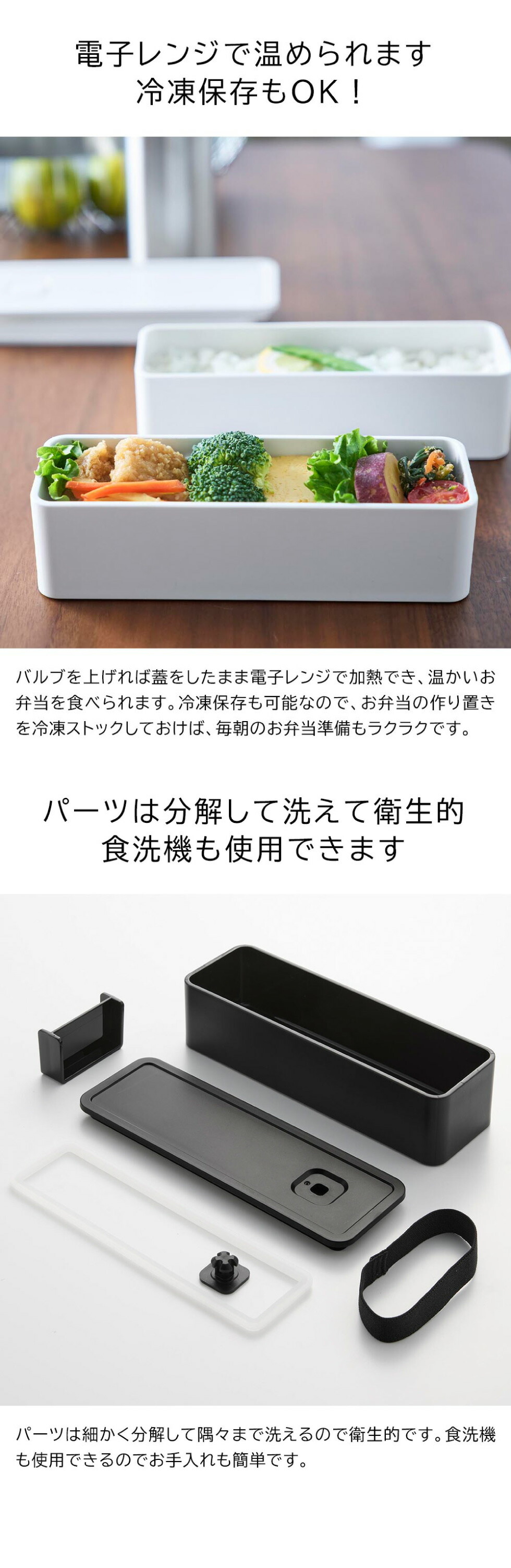 バルブをプッシュするだけで簡単に密閉できる、2段式のランチボックスです。食材の保存容器としてもおすすめで、すべてのパーツを分解して洗えるので衛生的です。食洗機OK。電子レンジOK。冷凍庫OK。