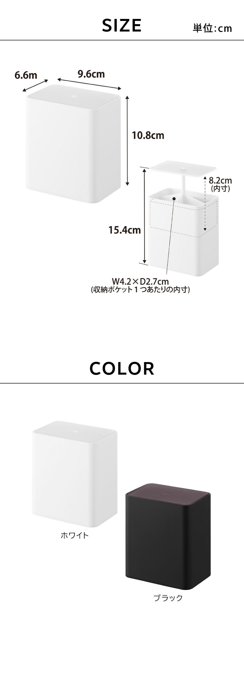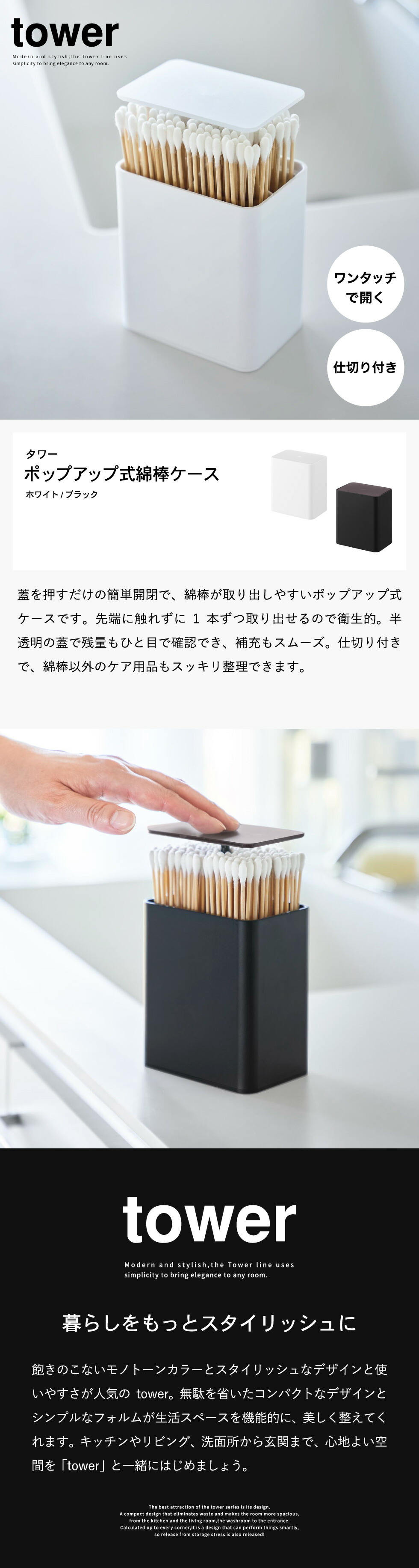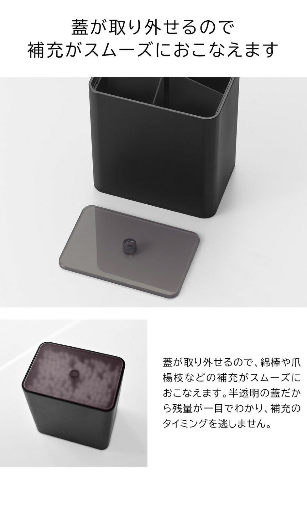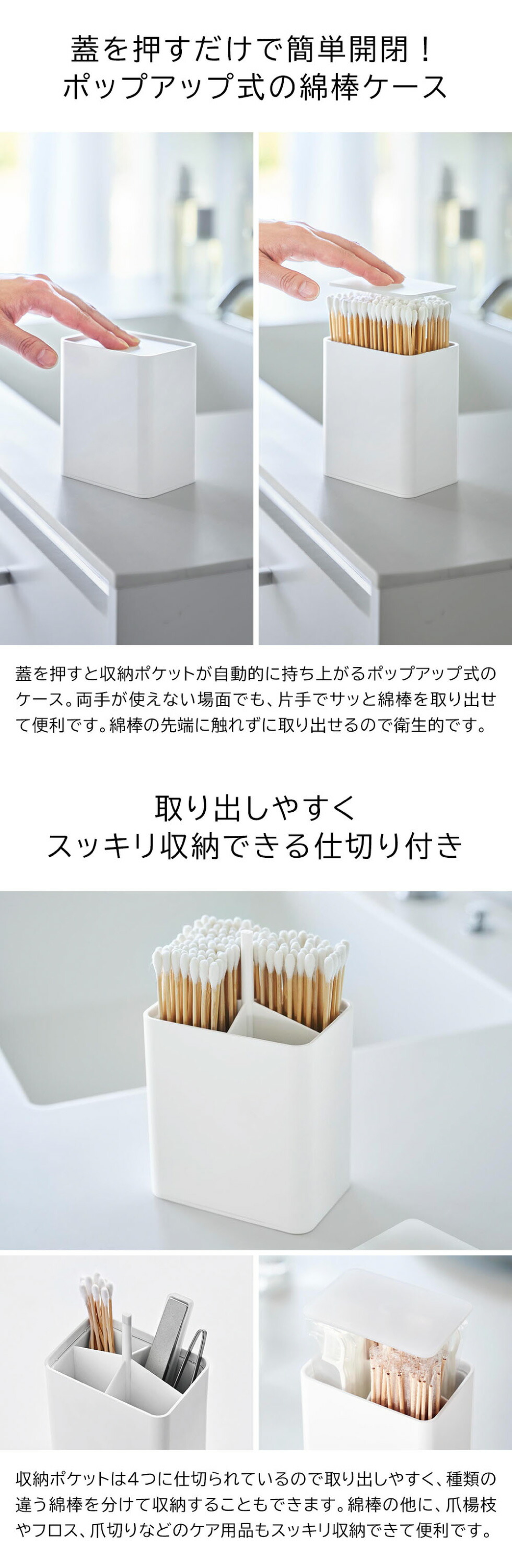 蓋を押すだけの簡単開閉で、綿棒が取り出しやすいポップアップ式ケースです。綿棒の先端に触れずに取り出せるので衛生的。半透明の蓋で残量がわかりやすく、取り外しも可能で補充もスムーズ。仕切り付きなので、ケア用品を種類ごとにスッキリ収納できます。