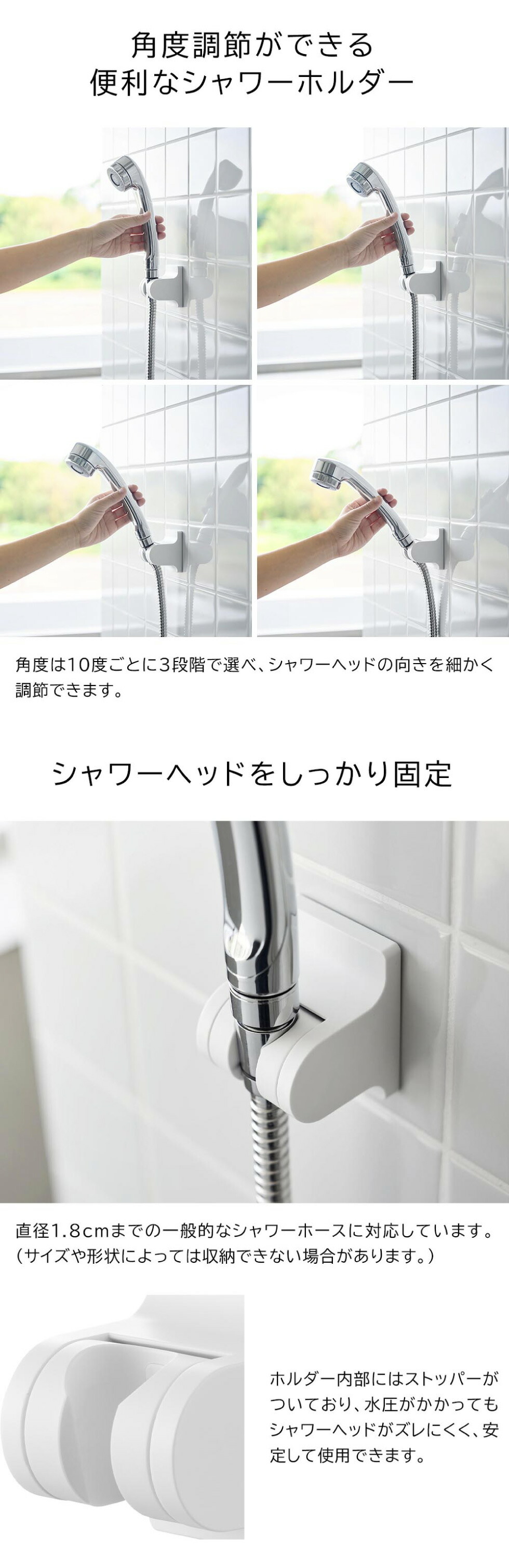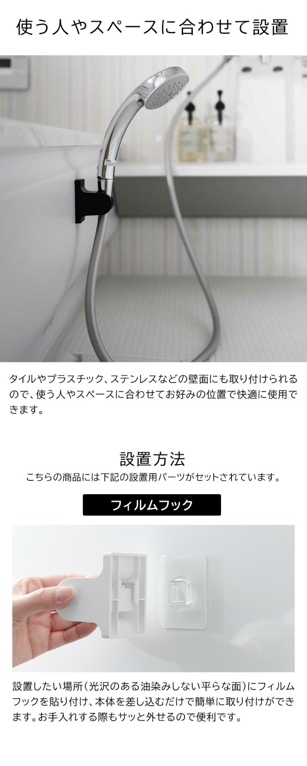 フィルムフックでお好みの位置に簡単取り付け!3段階の角度調節ができる便利なシャワーホルダーです。内側のストッパーで、水圧がかかってもズレにくく、浴槽まわりに取り付ければ、お子様やペットのシャワーの際にも便利です。