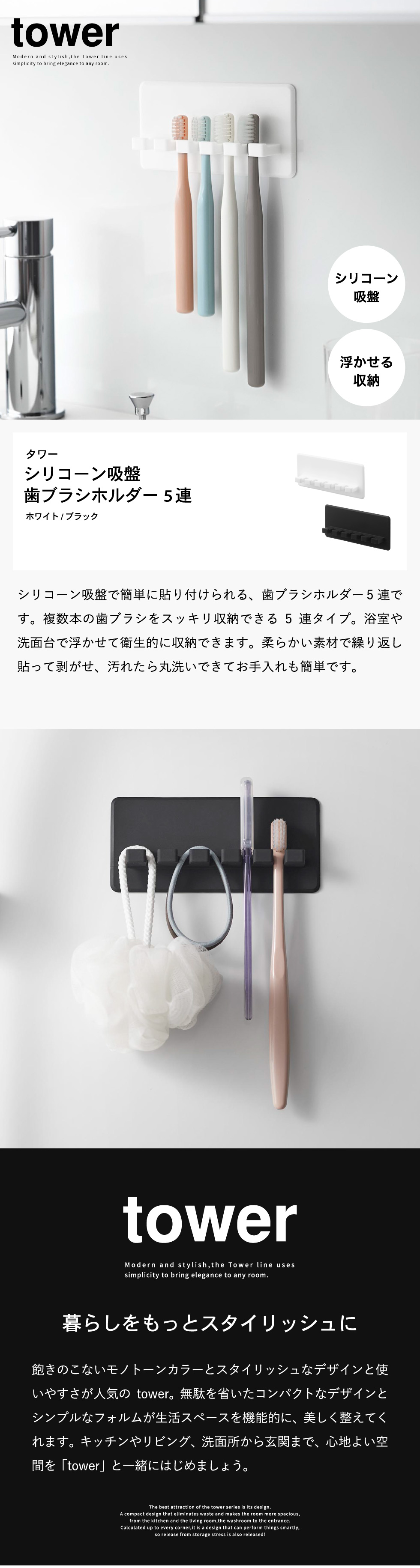 ホワイトとブラックを中心とした飽きのこないモノトーンカラーと、どんなインテリアにもスッと馴染むスタイリッシュなデザイン。そして、とことんシンプルながら、より豊かな暮らしを提案するアイデアがたくさん詰まった、使いやすいアイテムが人気です。無駄を省いたコンパクトなデザインと、シンプルなフォルムが生活スペースを機能的に、美しく整えてくれます。towerのアイテムをライン使いすれば、すっきりとした統一感が生まれ、お洒落でシックな雰囲気を演出します。キッチンやリビング、洗面所から玄関まで揃えたくなるtowerシリーズで、毎日の暮らしを彩る心地よい空間を。