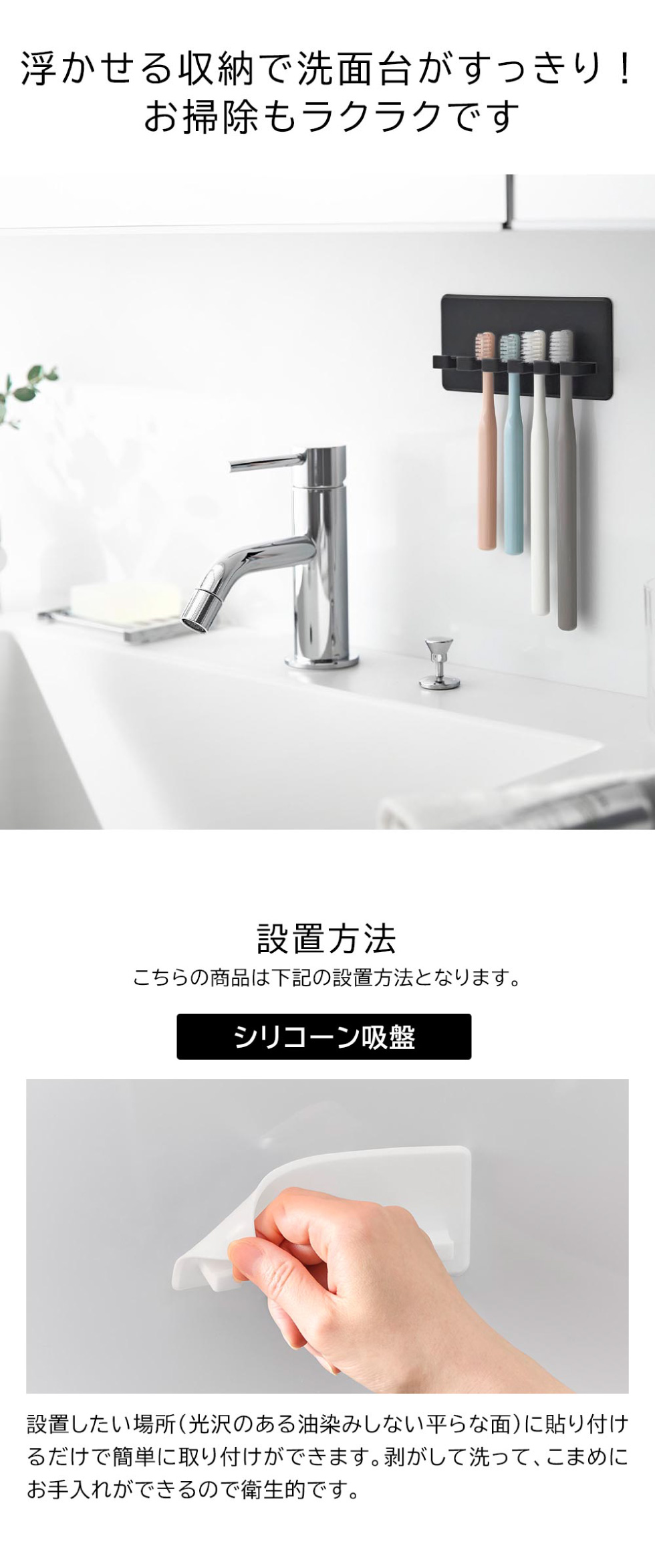 シリコーン吸盤で貼り付けるだけ!浮かせて衛生的に収納できる歯ブラシホルダー5連です。柔らかい素材なのでお手入れしやすく清潔!