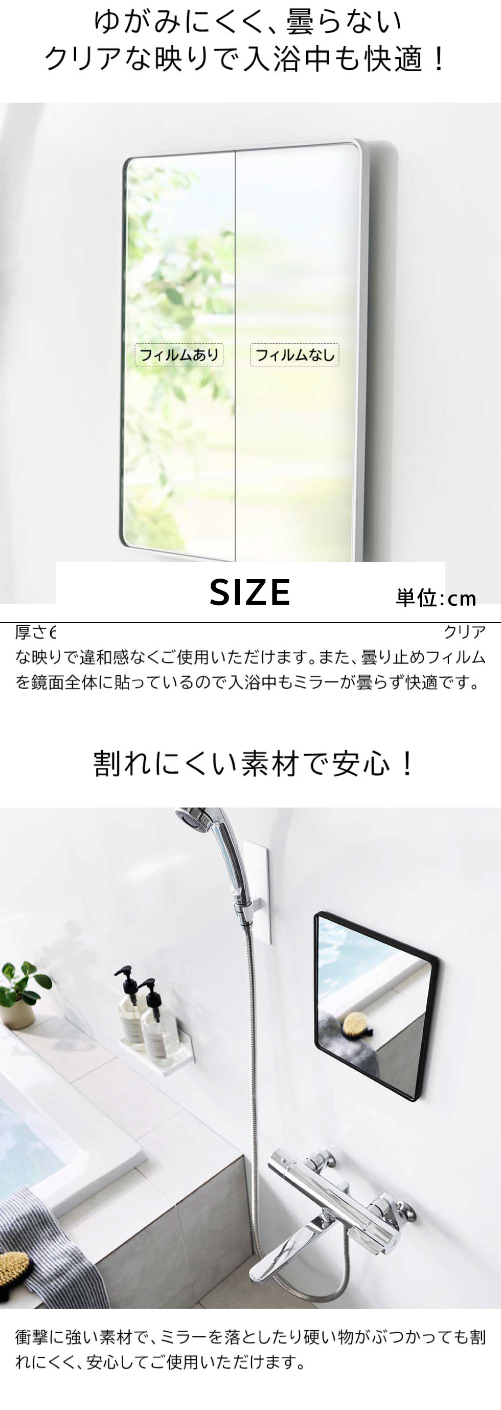 落としても割れにくい樹脂ミラー角型です。マグネットでお好みの場所に簡単に設置できます。曇り止め加工を施した厚さ6mmの樹脂製バスルームミラーで、ゆがみにくく衝撃にも強い仕様です。フレームと壁の隙間に指を入れやすい形状で、取り外しも簡単。お掃除がしやすく清潔に保てます。さらに、曇り止めフィルムを全面に粘着加工しているため、快適にお使いいただけます。