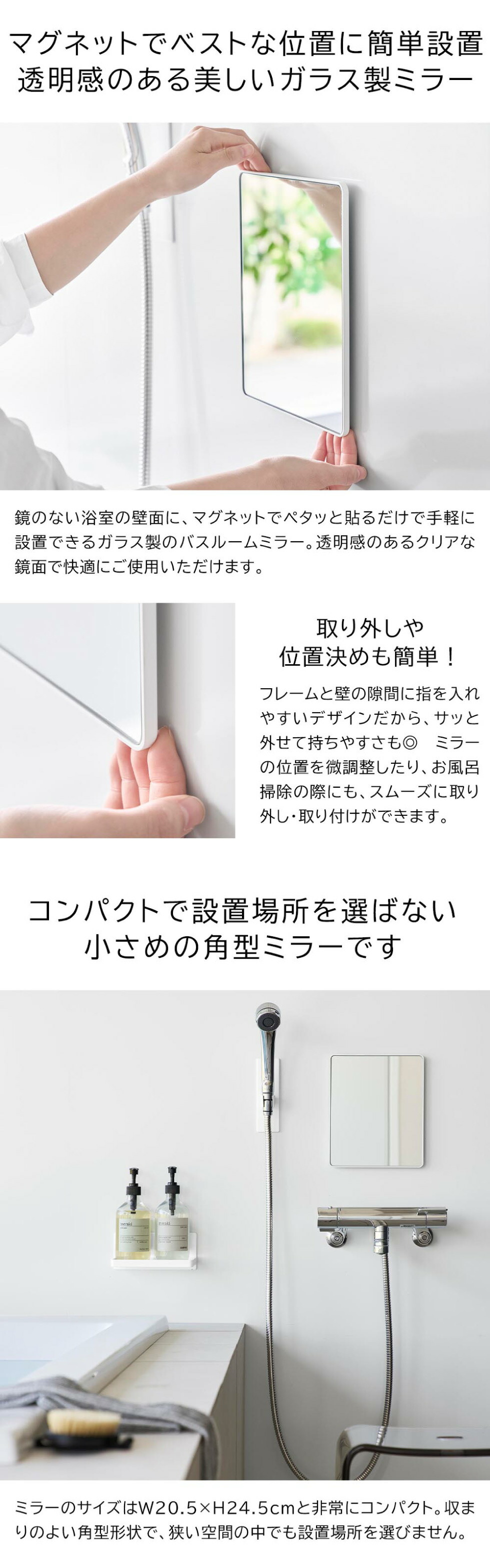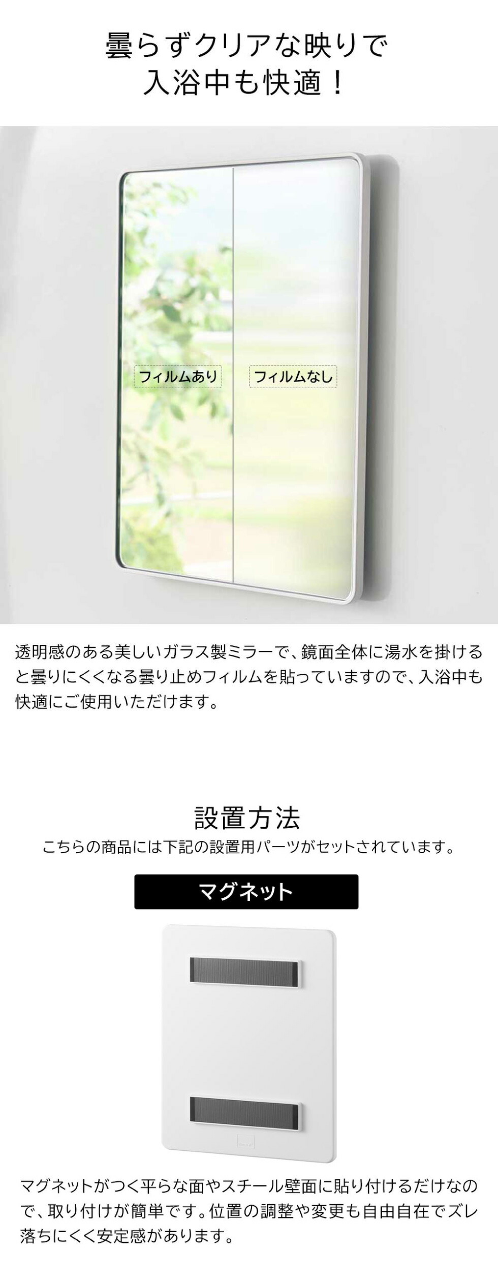 美しく、透明感があるガラス製バスルームミラー角型です。マグネットでお好みの場所に設置可能。曇り止め加工を施したガラス製バスルームミラーは、クリアで透明感がありキズがつきにくい仕様。フレームと壁の隙間に指を入れやすい形状で、取り外しも簡単。お掃除がしやすく清潔に保てます。さらに、曇り止めフィルムを全面に粘着加工しているため、快適にお使いいただけます。