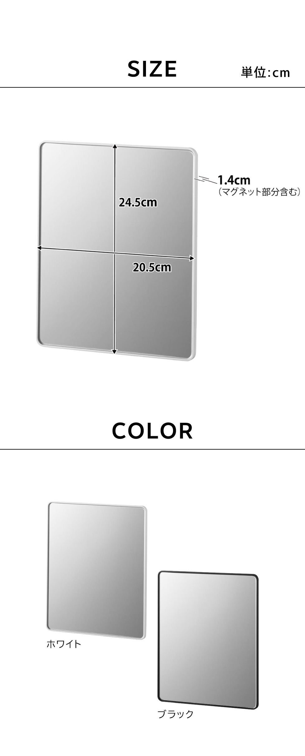 品質表示 フレーム:ABS樹脂 マグネット 滑り止め:シリコーンゴム ミラー:3mm厚ガラス 表面フィルム:PET |