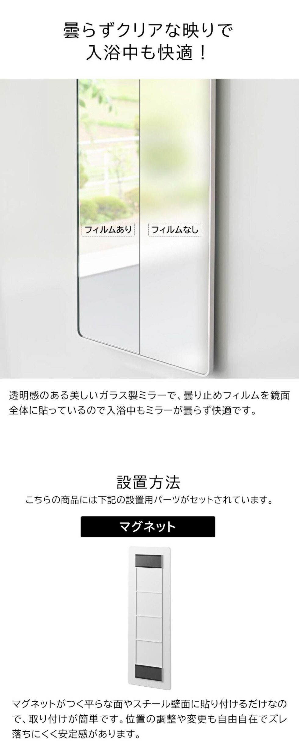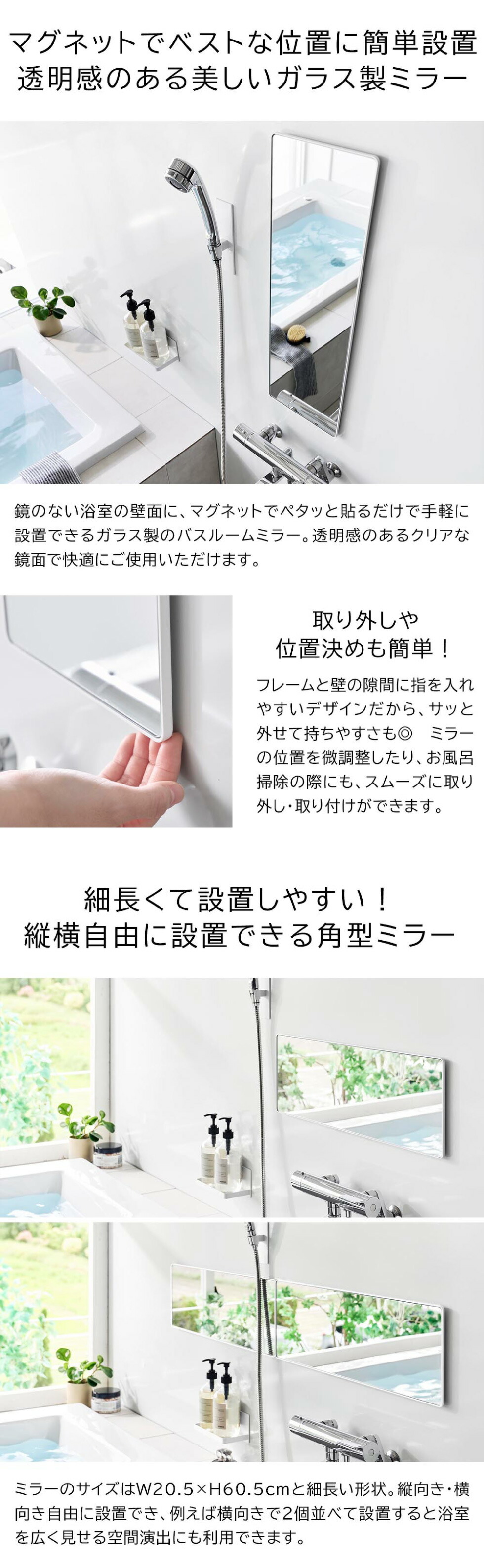 マグネットで簡単設置!透明感のあるガラス製の角型ロングミラー。縦向き・横向き設置自由!曇り止め加工で入浴中の使用感も◎ 着脱しやすいフレーム形状で場所移動もラクラク。