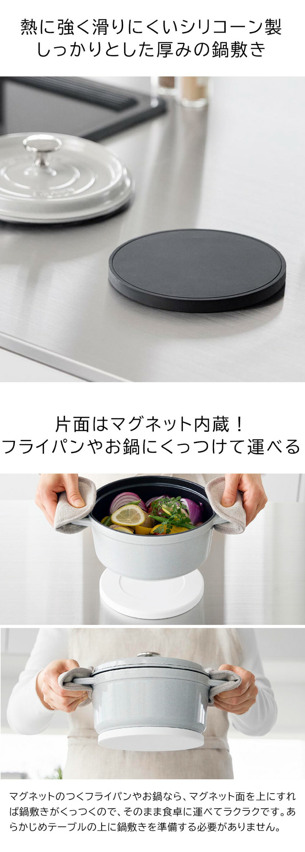 熱に強く、滑りにくい丸型のシリコーン製の鍋敷きです。マグネット内蔵のため、使わないときはスチール面に貼り付けてスッキリ収納できます。お鍋をマグネット面に載せて鍋敷きを付けたまま、そのまま食卓へ運べるので便利。※鍋の素材や形状、鍋底の凹凸によってはマグネットが十分に接着しない場合があります。