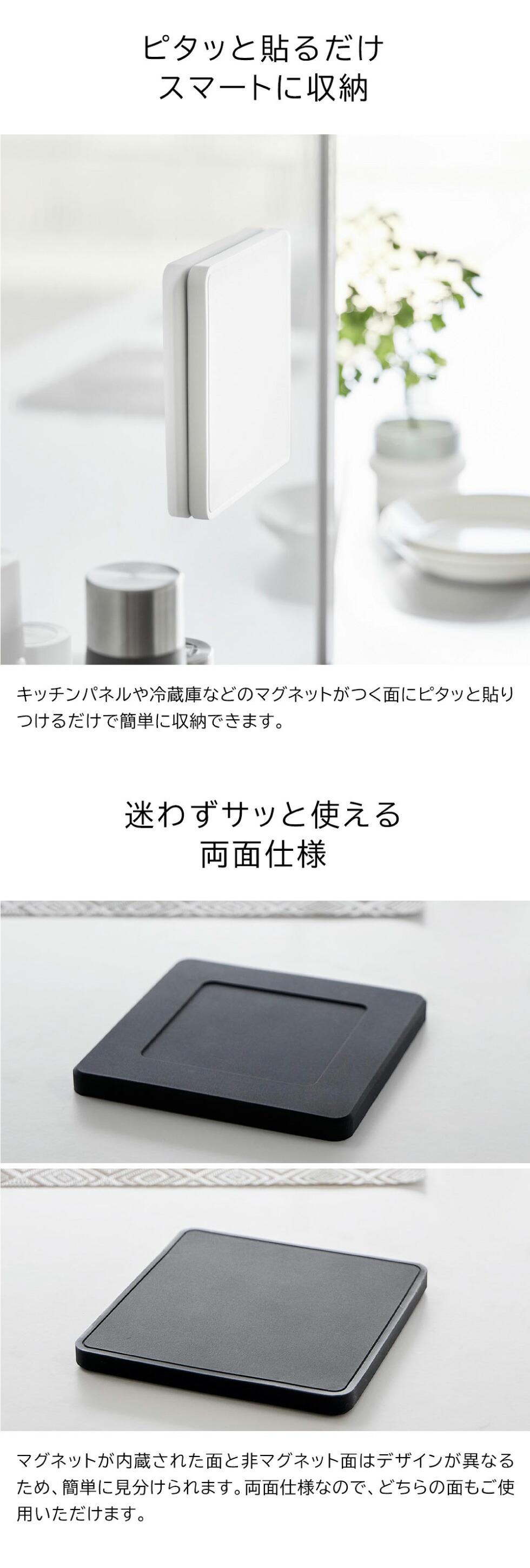 熱に強く滑りにくいシリコーン製の四角い鍋敷き。マグネットを内蔵しているのでスチール面にくっつけてピタッと収納。お鍋にくっつけてそのまま食卓へ運べて便利。 yamazaki