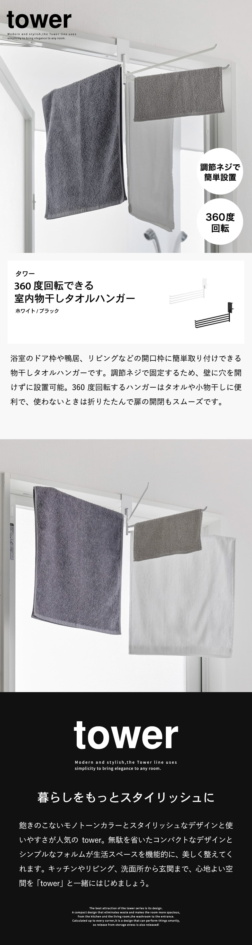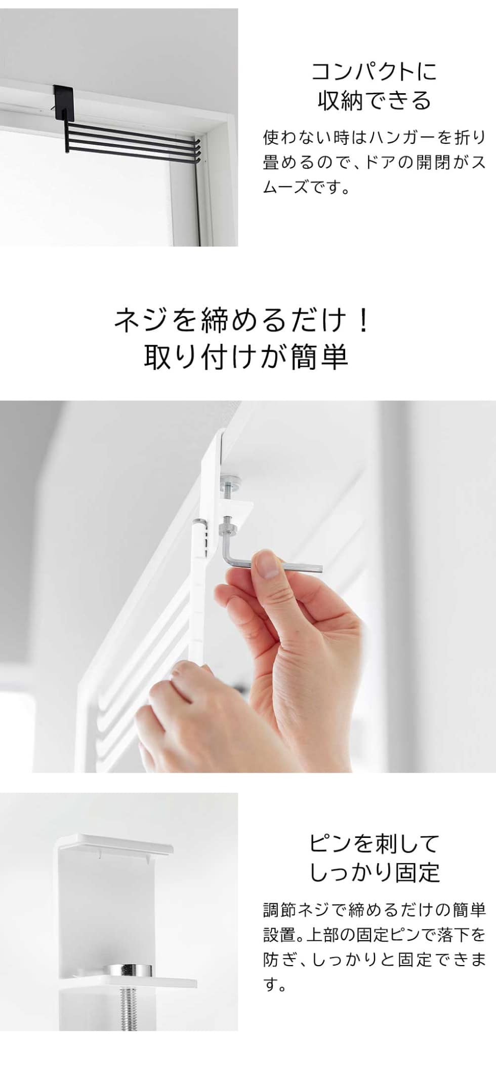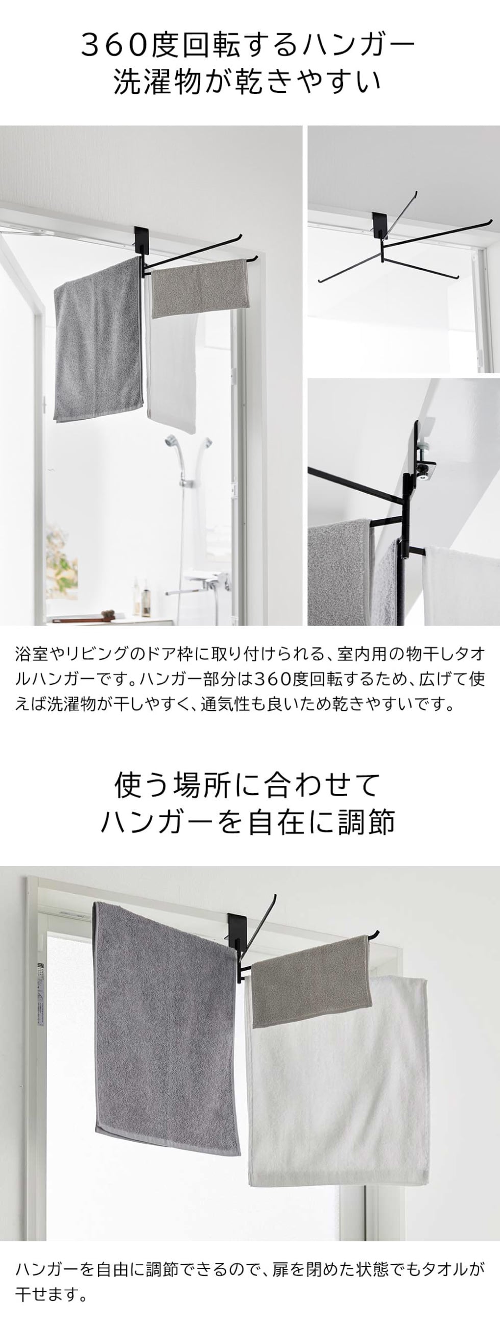浴室のドア枠や鴨居、リビングなどの開口枠に取り付け可能な、室内物干しタオルハンガーです。ハンガー部分は360度回転し、タオルはもちろん小物干しにもおすすめです。広げて使えば通気性が良く、乾きやすくて便利です。使わないときはスリムに畳めるので、扉の開閉を妨げません。調節ネジでしっかり固定でき、固定ピン付きで落下しにくい安心構造。取り付けも簡単です。