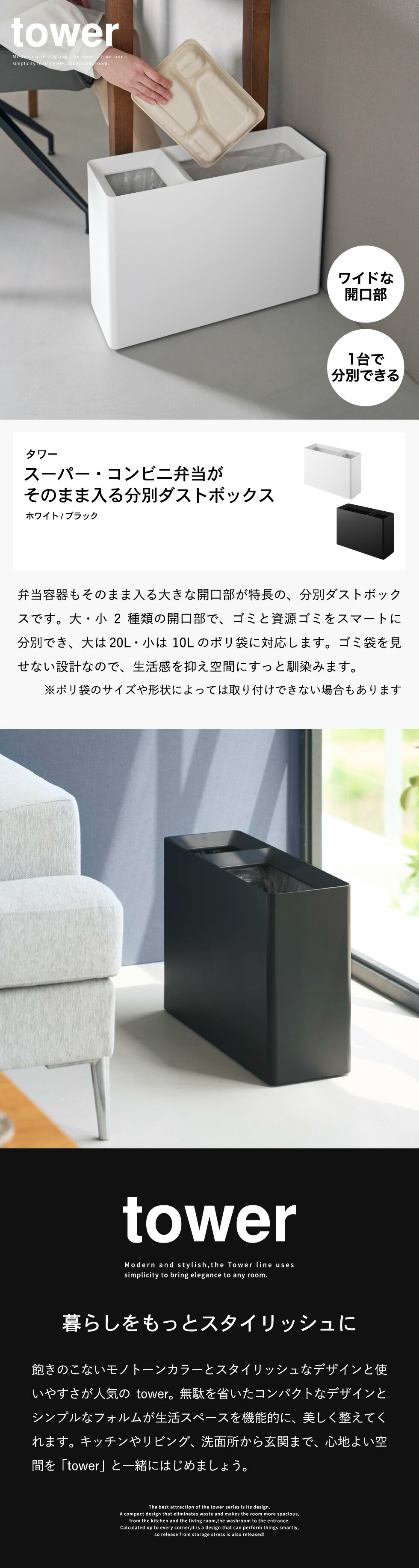 山崎実業 tower スーパー・コンビニ弁当がそのまま入る分別ダストボックス タワー 公式 10354 10355 ホワイト ブラック 送料無料