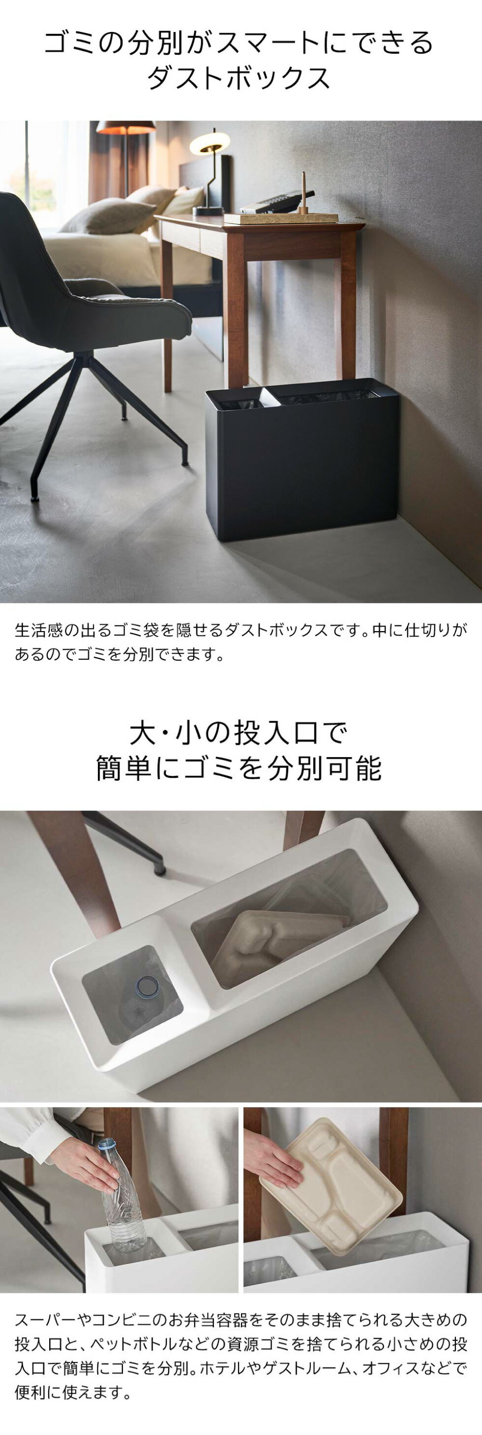 弁当容器を捨てられる大きな投入口とペットボトルなどを捨てられる小さめの投入口で、スマートに分別可能なダストボックス。ゴミ袋を見せない設計で空間にすっきりと馴染みます。