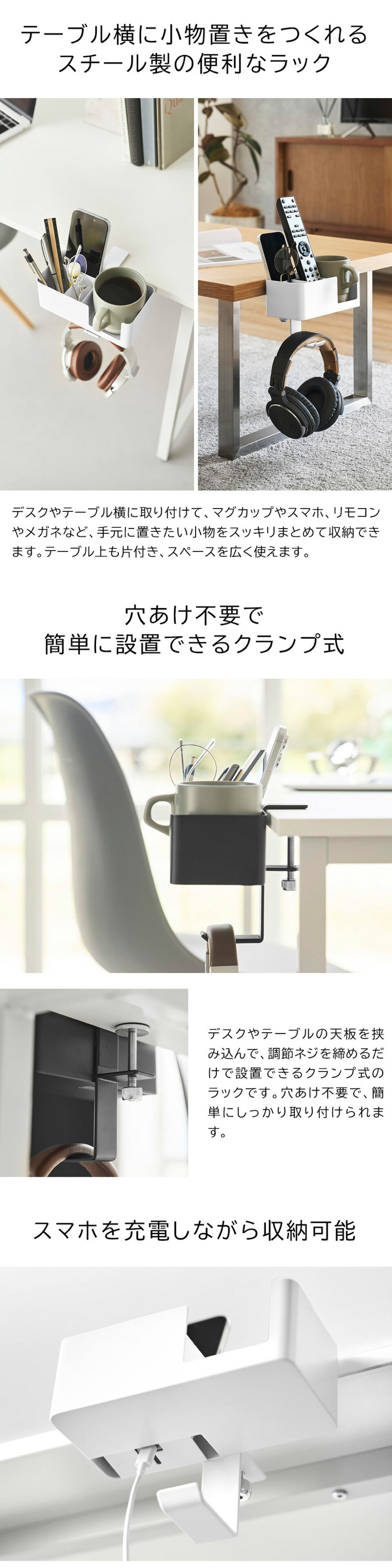 テーブル横に簡単に取り付けできる、便利な収納ラックです。クランプ式の固定構造でしっかりと設置できます。マグカップやスマートフォン、リモコン、メガネなど、置き場所に困る生活小物をまとめてスッキリ収納。ハンドル付きのコップも安定して置けるデザインで、シリコーン製マットがキズや転倒を防ぎます。スマートフォンを収納しながら充電することもでき、充電しないときは、ケーブルの先端を引っ掛けておくことができます。フックにはヘッドホンなどを掛けられて便利。マグネット付きの仕切りは、収納物に合わせて自由に位置を調整できます。