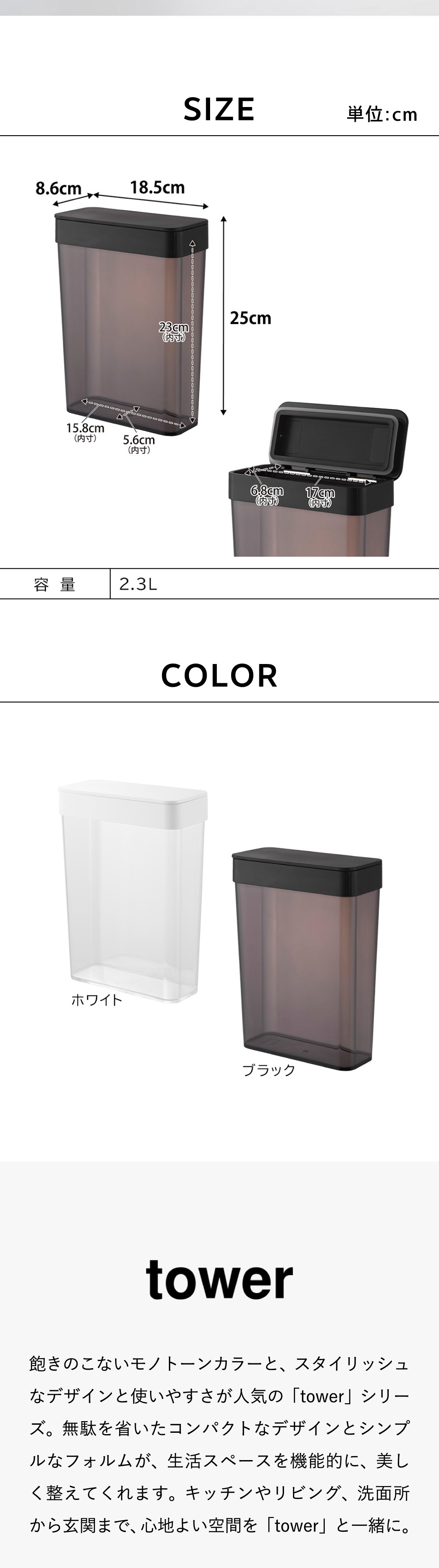 ホワイトとブラックを中心とした飽きのこないモノトーンカラーと、どんなインテリアにもスッと馴染むスタイリッシュなデザイン。そして、とことんシンプルながら、より豊かな暮らしを提案するアイデアがたくさん詰まった、使いやすいアイテムが人気です。無駄を省いたコンパクトなデザインと、シンプルなフォルムが生活スペースを機能的に、美しく整えてくれます。towerのアイテムをライン使いすれば、すっきりとした統一感が生まれ、お洒落でシックな雰囲気を演出します。キッチンやリビング、洗面所から玄関まで揃えたくなるtowerシリーズで、毎日の暮らしを彩る心地よい空間を。