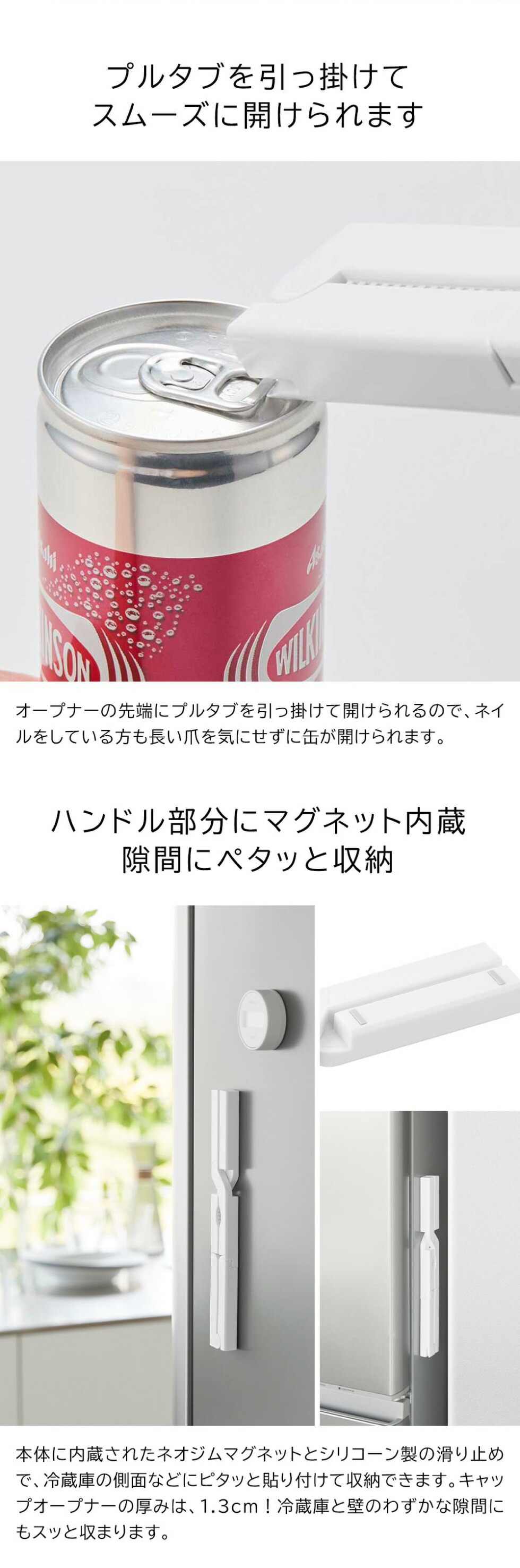 軽い力でビンやペットボトルなどの蓋を開けられるマグネット内蔵のキャップオープナー。プルタブを引っ掛けて開けることもできるのでネイルをしている方にもおすすめ yamazaki