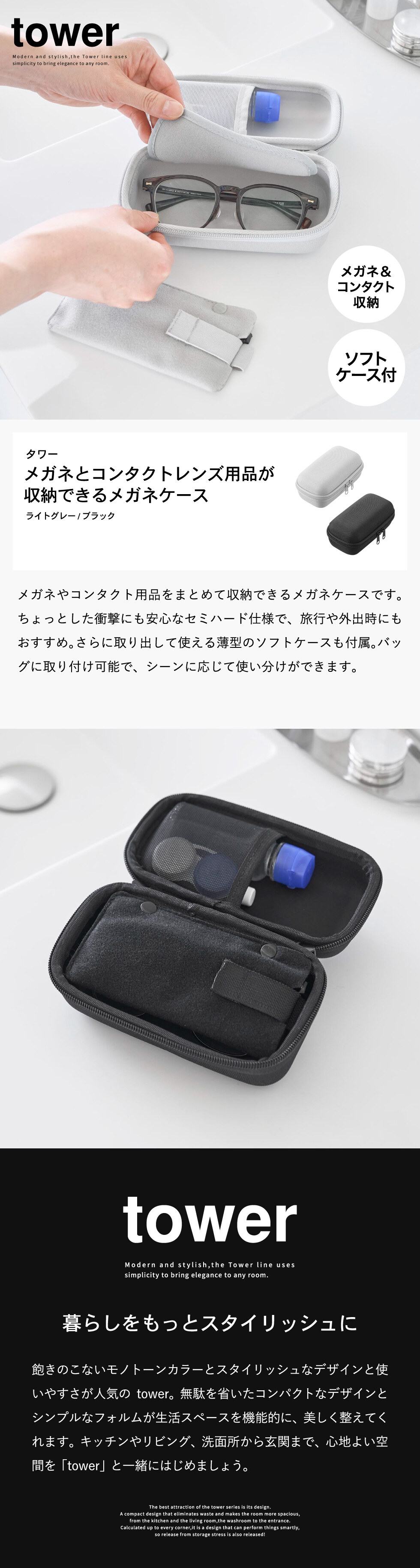 山崎実業 tower メガネとコンタクトレンズ用品が収納できるメガネケース タワー 公式 10438 10439 ライトグレー ブラック