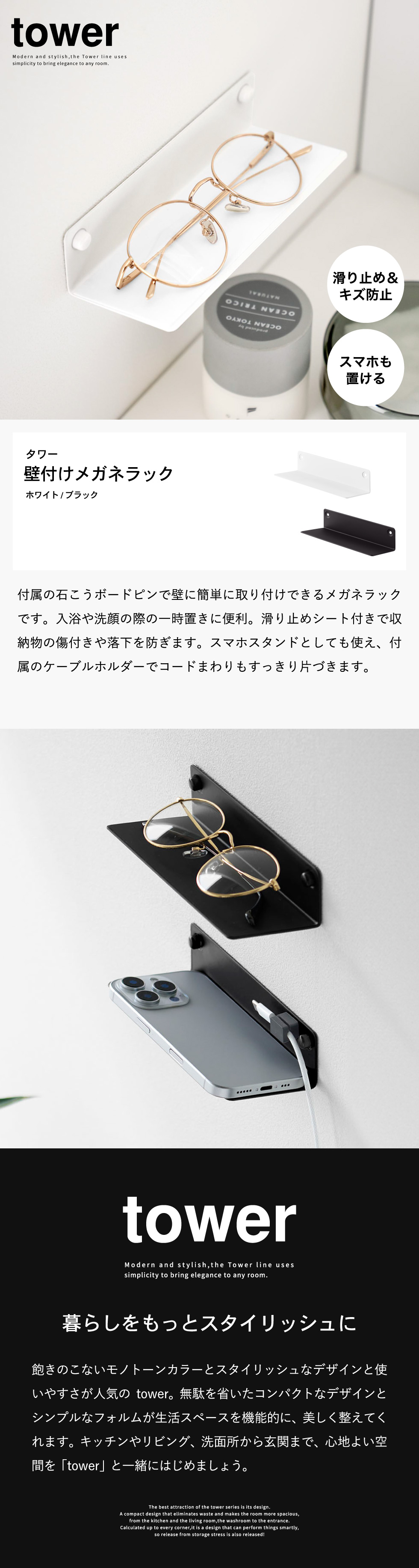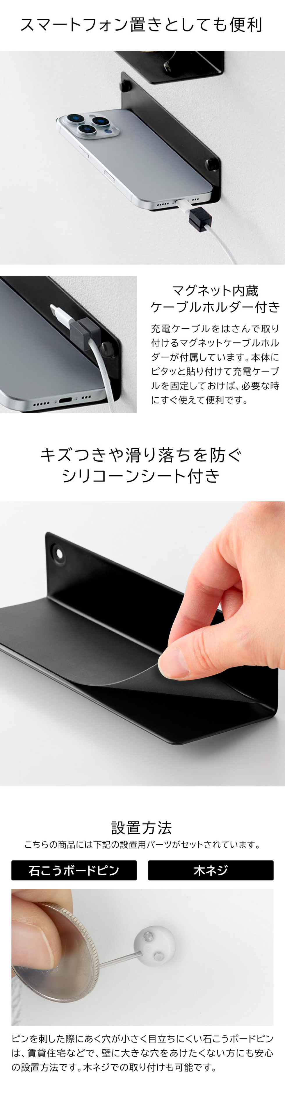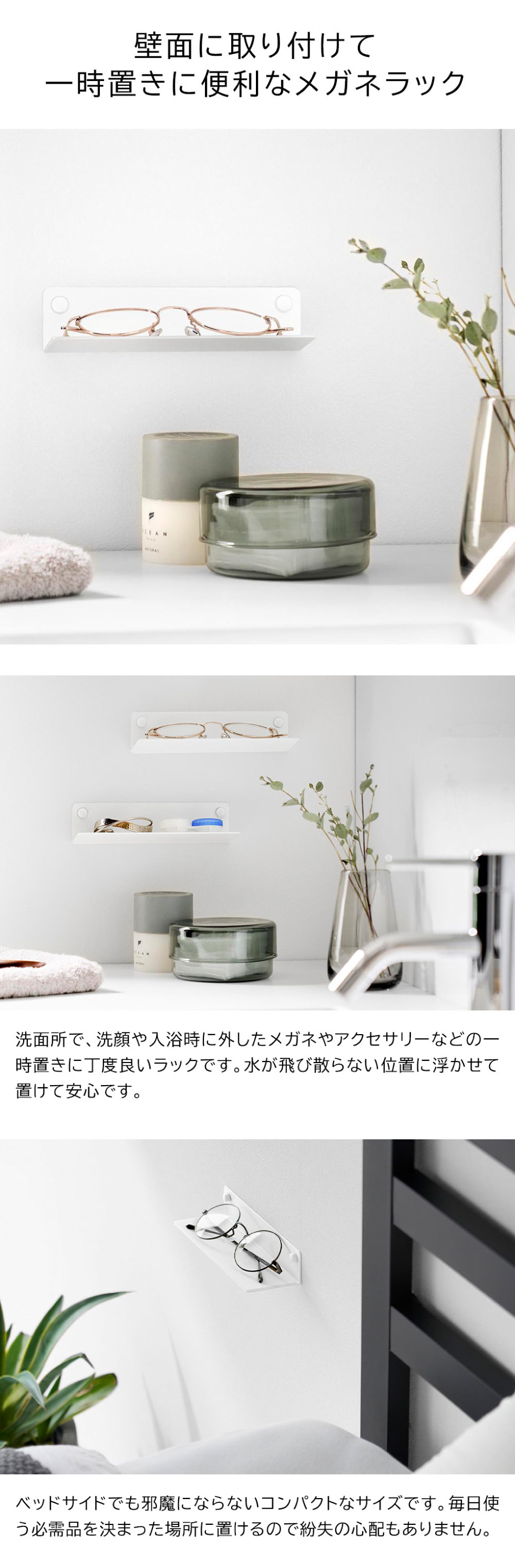 石こうボードピンで壁に簡単に設置できるメガネラックです。入浴や洗顔時の一時置きに便利!滑り止めシートが付いているので収納物のキズや滑り落ちを防ぎます。スマホ置きとしての使用もおすすめで、付属のマグネットケーブルホルダーを本製品に取り付ければケーブルの整理にも便利です。