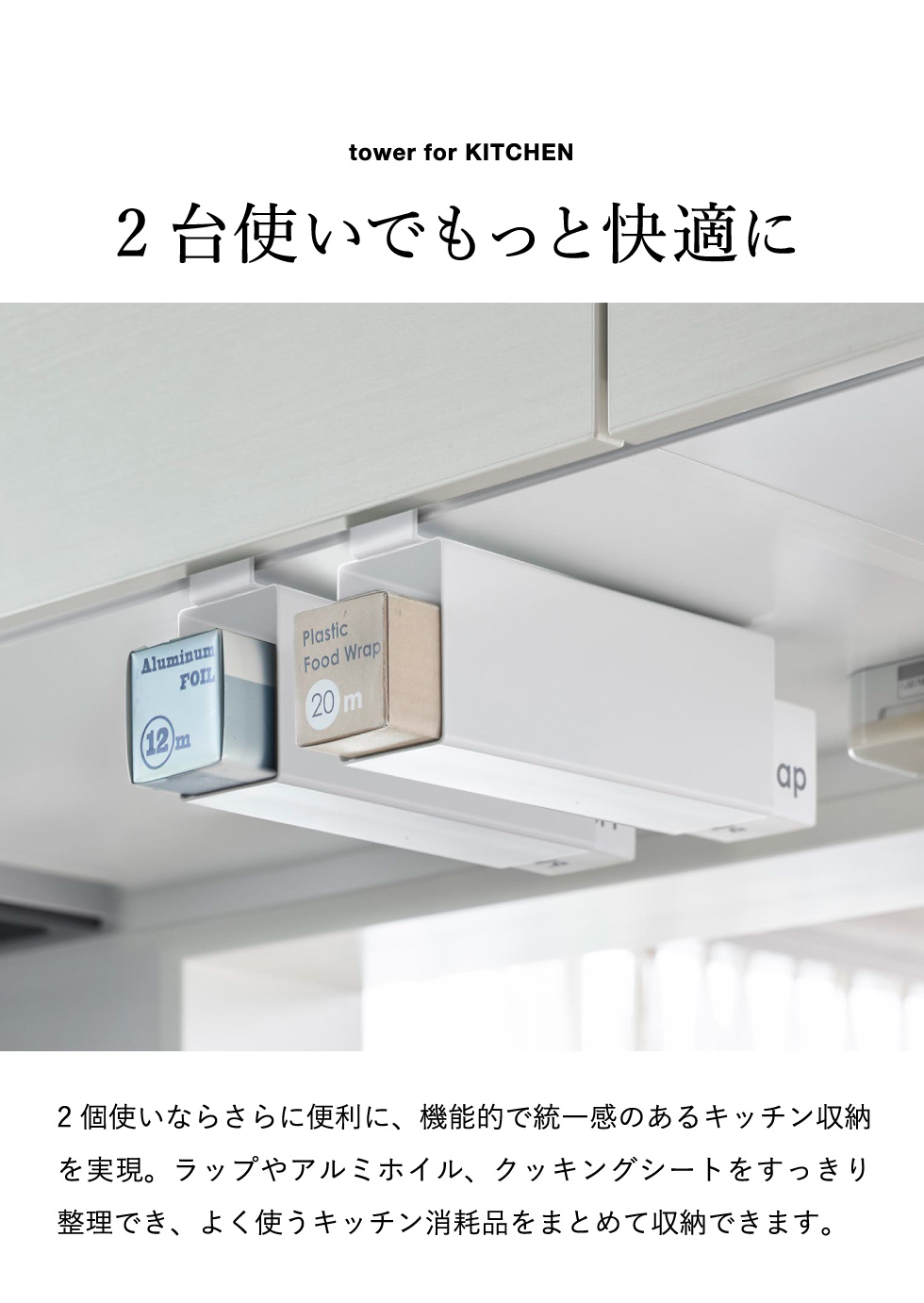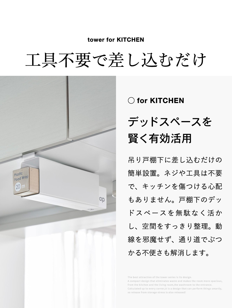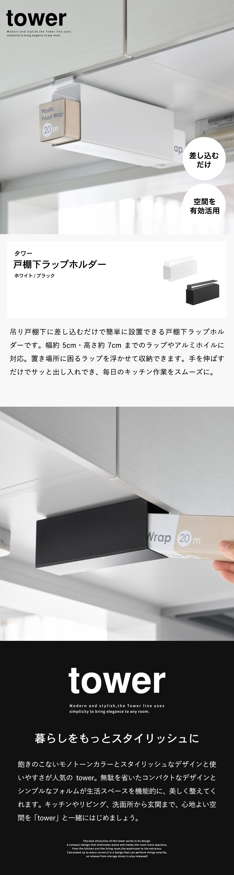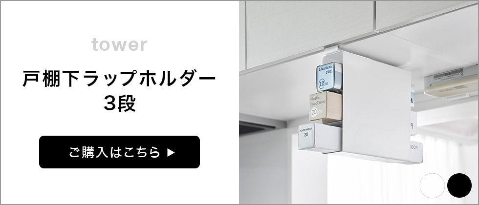 戸棚下に差し込むだけで設置できるラップホルダー。置き場所に困るラップを浮かせて収納でき、戸棚下のスペースを有効活用。タワーシリーズ yamazaki