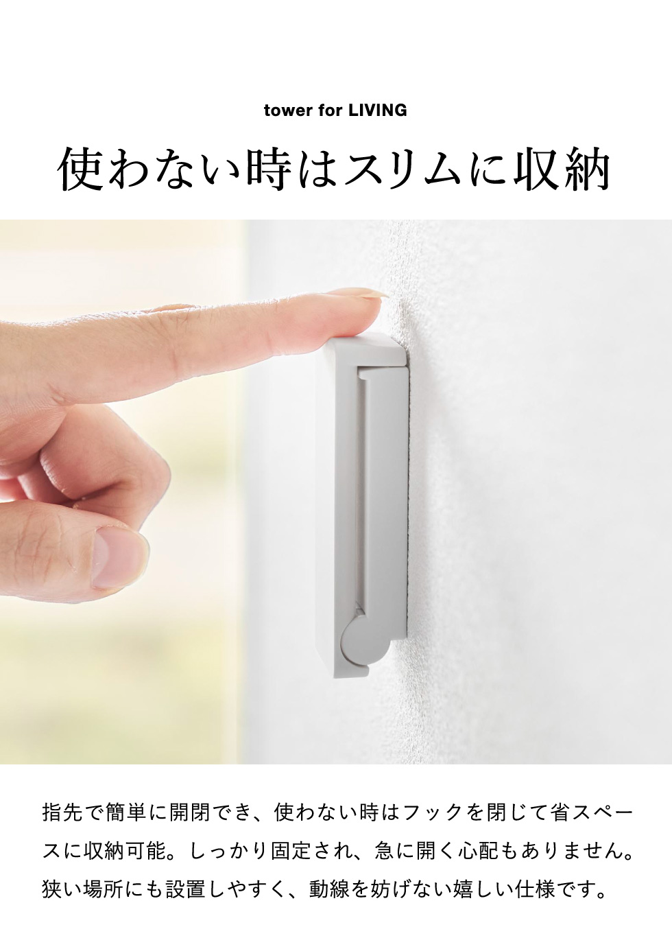 石こうボードピンでお好みの場所に設置できる、折り畳み式フックです。リュックや帽子を床に置かず、壁にすっきり収納できます。使わない時は折り畳んで省スペースに。壁の穴が目立ちにくい石こうボードピンで簡単取り付け。木ネジでも取り付け可能。