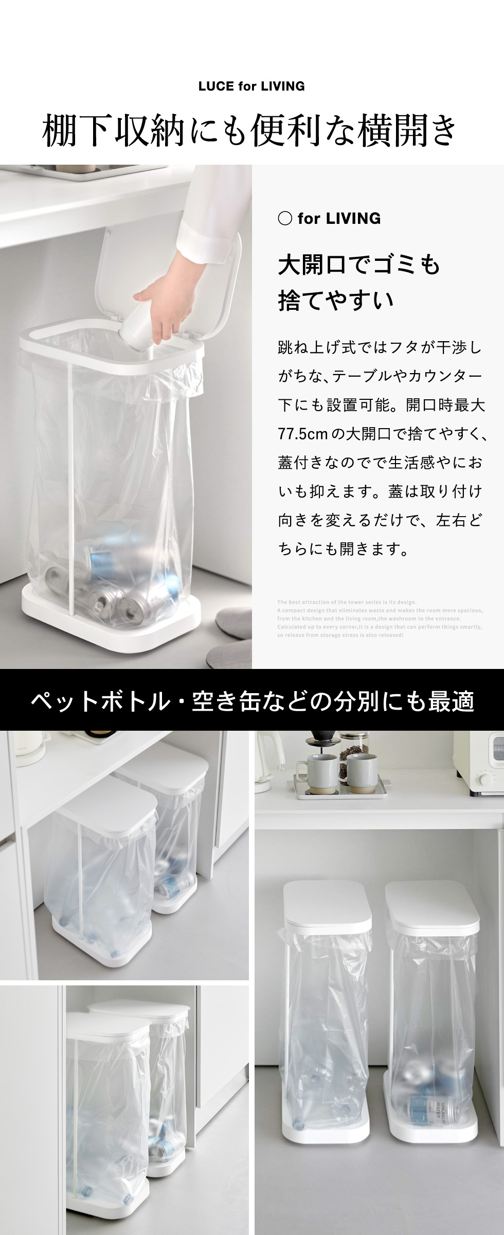 横開きの大開口で捨てやすい、キャスター付き分別ゴミ袋ホルダーです。棚下にもスッキリ収まり、フレーム構造によりゴミ袋の容量を無駄なく活用できます。蓋は取り付け向きを変えることで左右どちら開きにも対応。蓋開口時の高さは最大77.5cmで、大きく開くため捨てやすい設計です。複数並べて、ペットボトル・空き缶・資源ゴミなどの分別にも最適。蓋付きなので、においも軽減できます。台座後方にはキャスターが付いており、軽く持ち上げるだけでスムーズに移動可能。床にキズがつきにくい仕様です。また、台座前方には蓋を外す際に足で押さえやすいシリコーン製クッション付き。ゴミ袋の取り付けも簡単で、袋を掛けて蓋をするだけ。交換時も蓋を外し手前から引き抜くだけで、ゴミ袋の交換がラクに行えます。