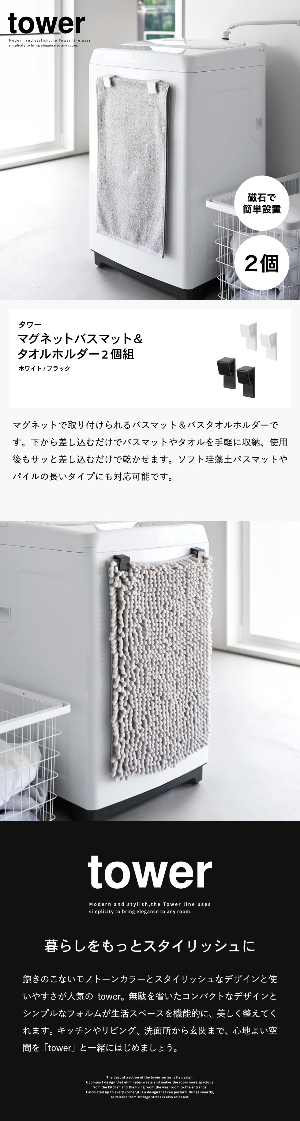 ホワイトとブラックを中心とした飽きのこないモノトーンカラーと、どんなインテリアにもスッと馴染むスタイリッシュなデザイン。そして、とことんシンプルながら、より豊かな暮らしを提案するアイデアがたくさん詰まった、使いやすいアイテムが人気です。無駄を省いたコンパクトなデザインと、シンプルなフォルムが生活スペースを機能的に、美しく整えてくれます。towerのアイテムをライン使いすれば、すっきりとした統一感が生まれ、お洒落でシックな雰囲気を演出します。キッチンやリビング、洗面所から玄関まで揃えたくなるtowerシリーズで、毎日の暮らしを彩る心地よい空間を。