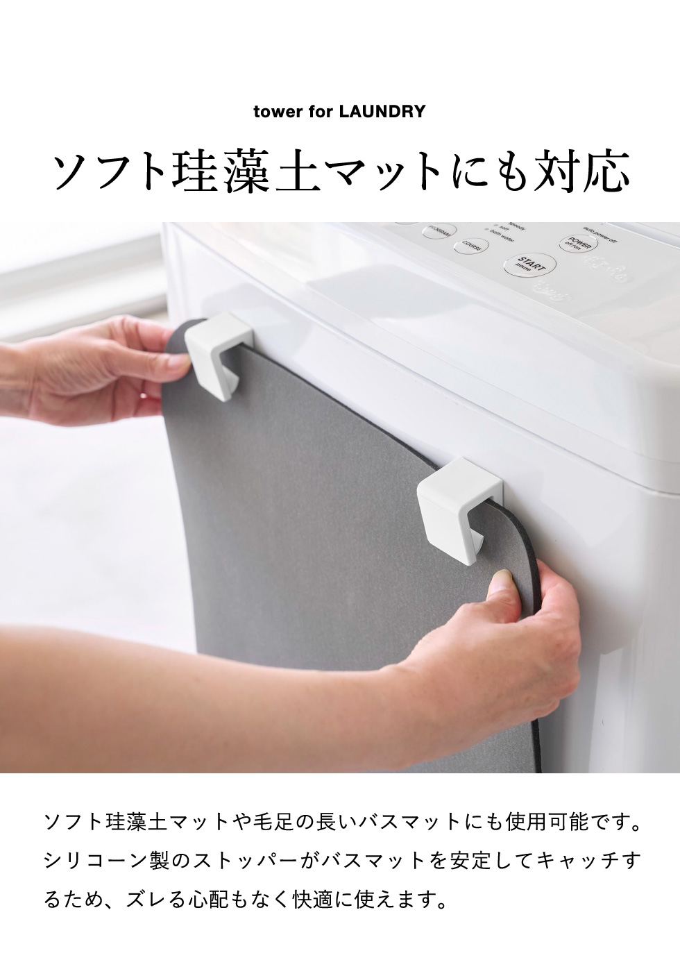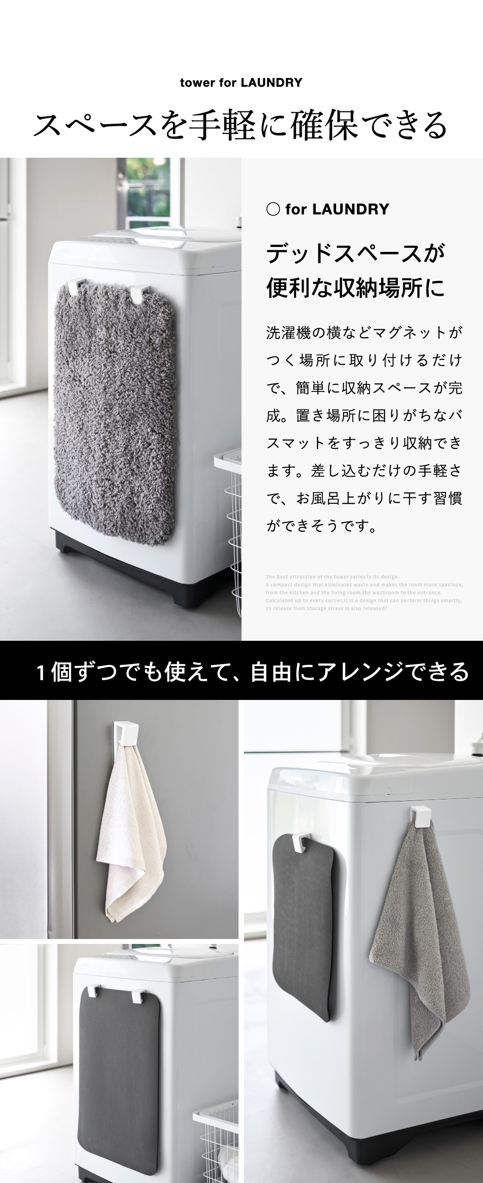 マグネットで簡単に取り付けられる、バスマット&バスタオルホルダーです。下から差し込むだけでバスマットやタオルを手軽に収納でき、使用後はサッと差し込むだけで乾かせます。ソフト珪藻土バスマットやパイルの長いバスマットにも対応。シリコーン製のストッパーがバスマットをしっかりキャッチし、安定して収納できます。1個ずつでも使用でき、キッチンクロスなどの収納にもおすすめです。
