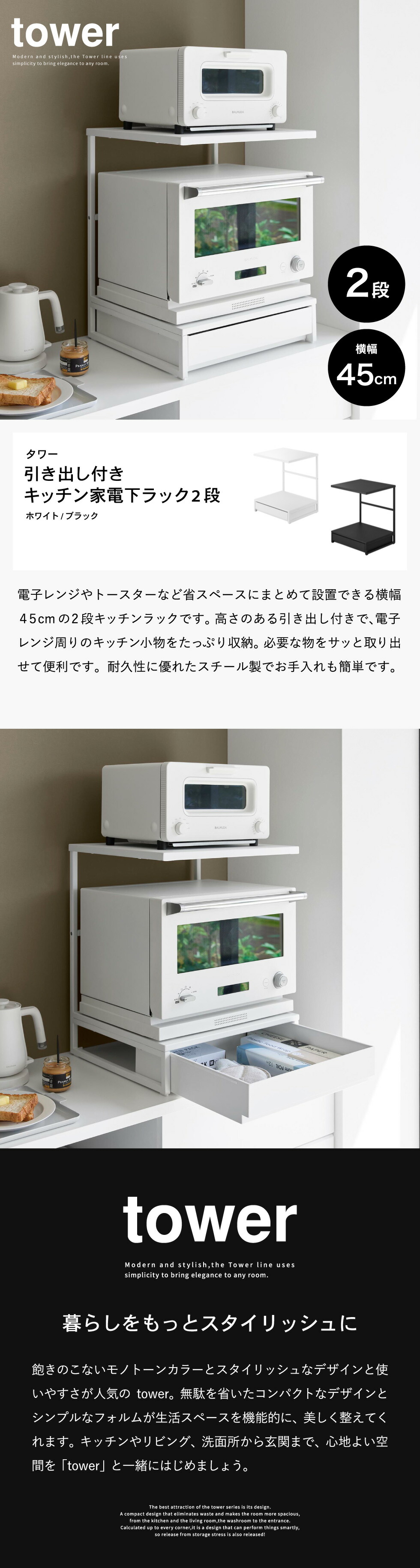 引き出し付きキッチン家電下ラック タワー 2段