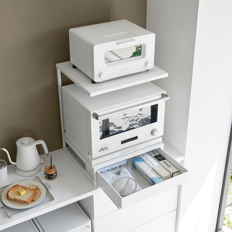 電子レンジやトースターなどキッチン家電を、省スペースにまとめて設置できるキッチンラック2段です。高さのある引き出し付きで、電子レンジ周りのキッチン小物をたっぷり収納できます。必要な物をスムーズに取り出せて便利です。