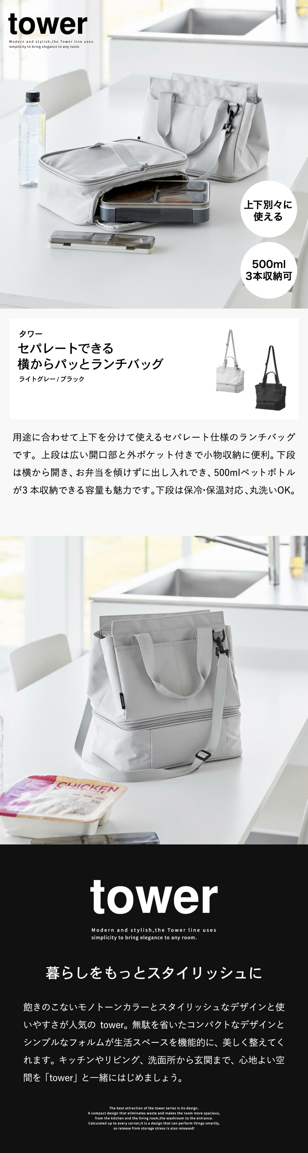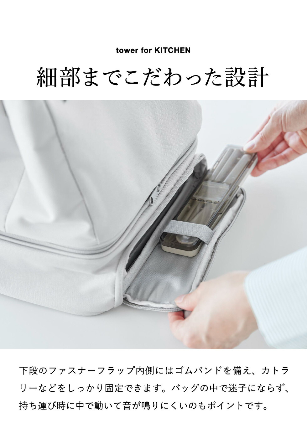 用途に合わせてセパレート使いができる、便利なランチバッグです。下段は取り出し口が大きく開くので、お弁当を傾けずに収納でき、出し入れもスムーズ。カトラリーを固定できるゴムバンド付きで持ち運びも安心です。500mLのペットボトルが3本収納可能で、おうちで丸洗いできるため、いつでも清潔に保てます。※下段バッグのみの仕様です。上段は普段使いのバッグとしても活躍します。ファスナー付きで中身が見えず安心。外ポケットが2つ付いており、小物の収納にも便利です。バッグサイドのボタンでサイズ感を調整でき、シーンに合わせてスリムにも。ファスナー仕様により、上下を簡単に分けてセパレート使用が可能です。※バッグ(下段)のみ保冷・保温機能があります。