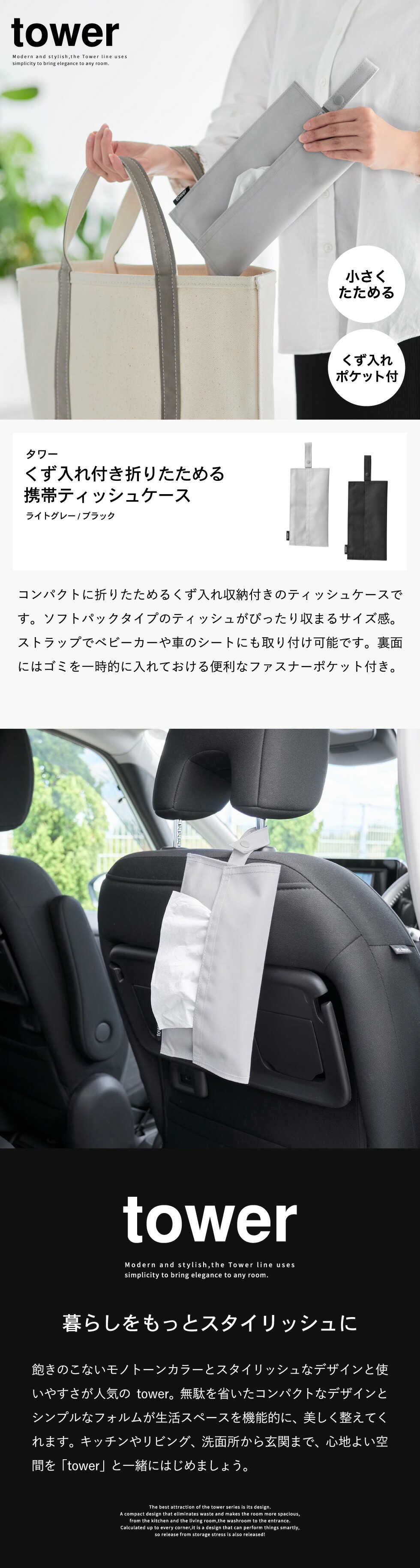 ホワイトとブラックを中心とした飽きのこないモノトーンカラーと、どんなインテリアにもスッと馴染むスタイリッシュなデザイン。そして、とことんシンプルながら、より豊かな暮らしを提案するアイデアがたくさん詰まった、使いやすいアイテムが人気です。無駄を省いたコンパクトなデザインと、シンプルなフォルムが生活スペースを機能的に、美しく整えてくれます。towerのアイテムをライン使いすれば、すっきりとした統一感が生まれ、お洒落でシックな雰囲気を演出します。キッチンやリビング、洗面所から玄関まで揃えたくなるtowerシリーズで、毎日の暮らしを彩る心地よい空間を。