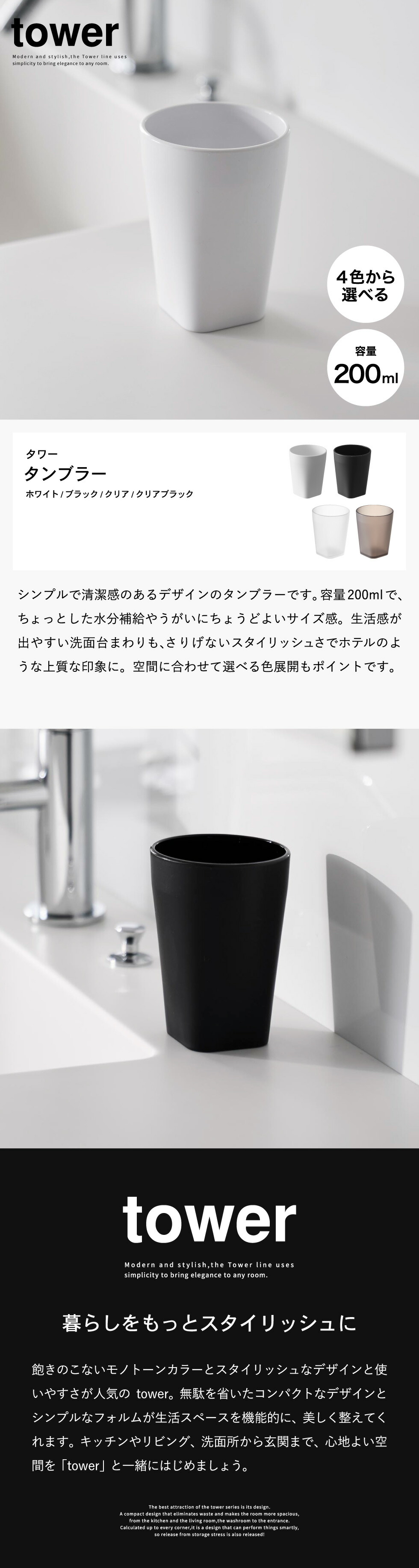 ホワイトとブラックを中心とした飽きのこないモノトーンカラーと、どんなインテリアにもスッと馴染むスタイリッシュなデザイン。そして、とことんシンプルながら、より豊かな暮らしを提案するアイデアがたくさん詰まった、使いやすいアイテムが人気です。無駄を省いたコンパクトなデザインと、シンプルなフォルムが生活スペースを機能的に、美しく整えてくれます。towerのアイテムをライン使いすれば、すっきりとした統一感が生まれ、お洒落でシックな雰囲気を演出します。キッチンやリビング、洗面所から玄関まで揃えたくなるtowerシリーズで、毎日の暮らしを彩る心地よい空間を。