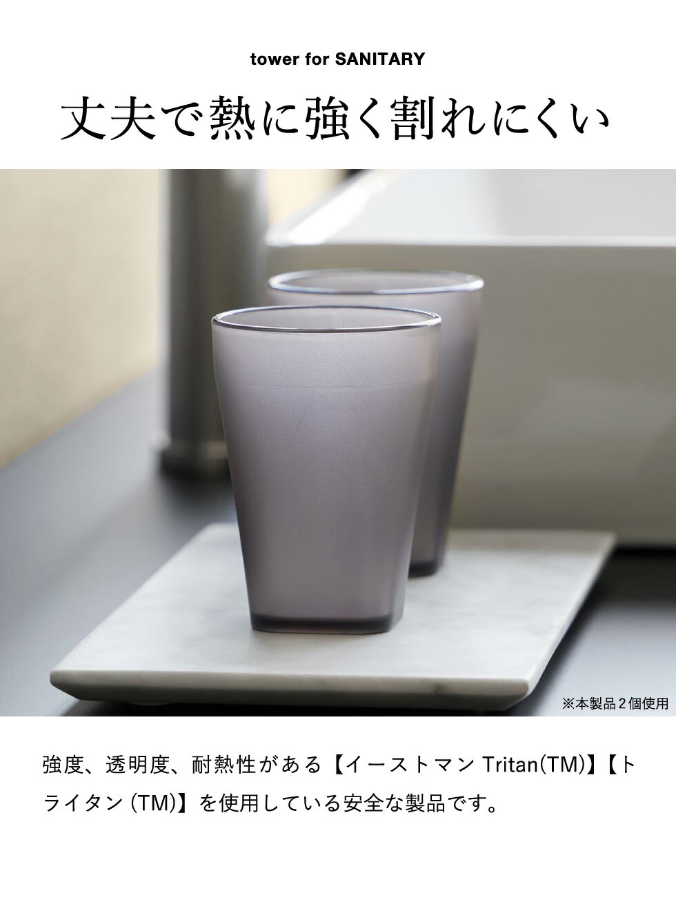 丈夫で熱に強く、割れにくい。シンプルで清潔感のあるタンブラーです。食洗機OK。※人体に影響する可能性が示唆される化学物質(BPA)を含まず、強度、透明度、耐熱性がある【イーストマン Tritan(TM)】【トライタン(TM)】を使用している安全な製品です。